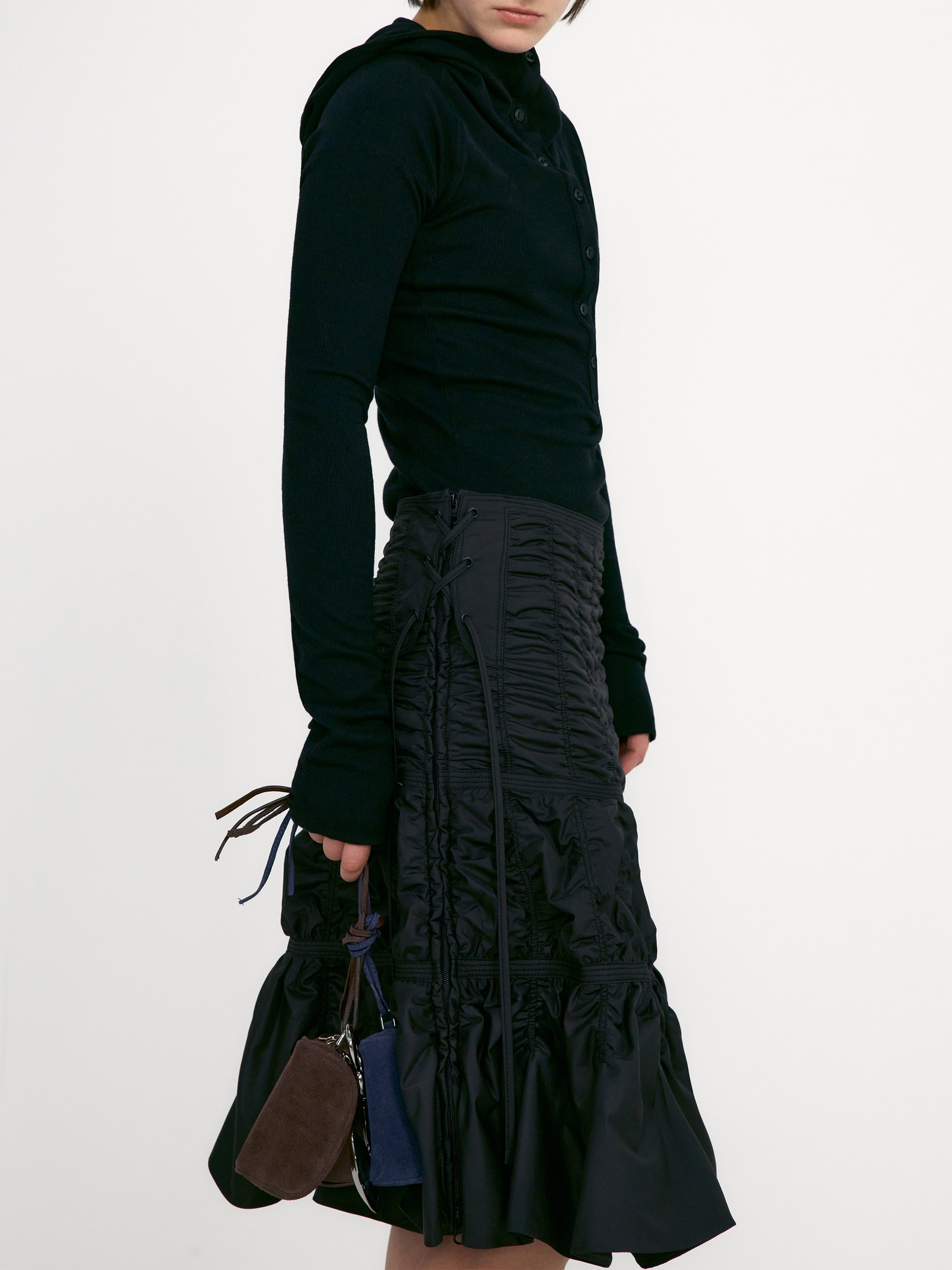 這款連帽上衣以柔軟親膚的羅紋面料製成,穿著舒適貼合。胸前延伸至領口的鈕扣細節增添造型變化,可依喜好全扣呈現高領效果。無論單穿或作為內搭,都能輕鬆展現層次;偏長的袖型設計既帶來個性感,也營造修長的手臂視覺比例。