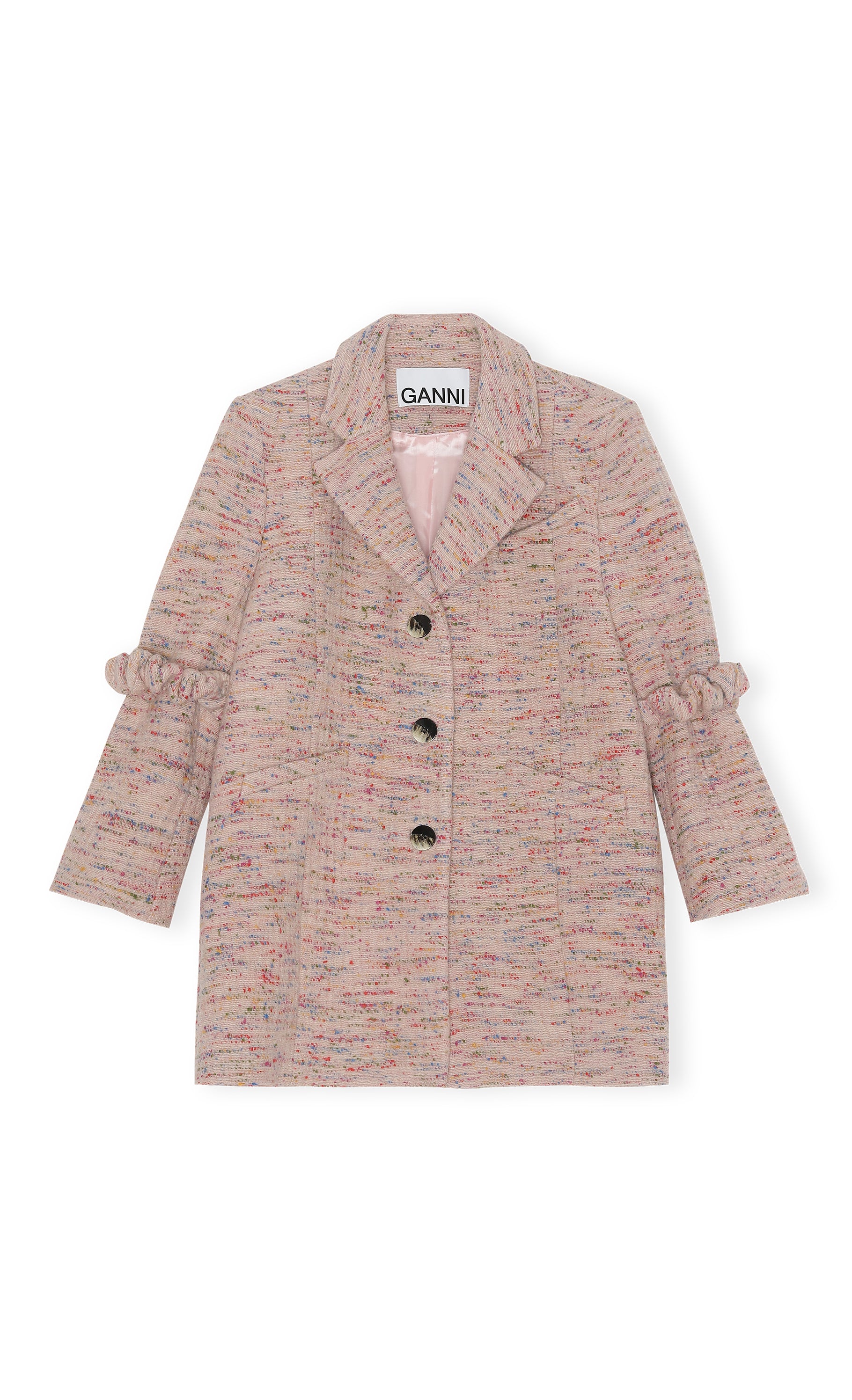 GANNI 經典西裝外套迎來全新演繹。以羊毛混紡混色粗花呢製成,版型俐落而帶有率性寬鬆感。手肘處皆有同布料鬆緊髮圈,可用來收束袖口,為造型增添趣味與靈活變化。