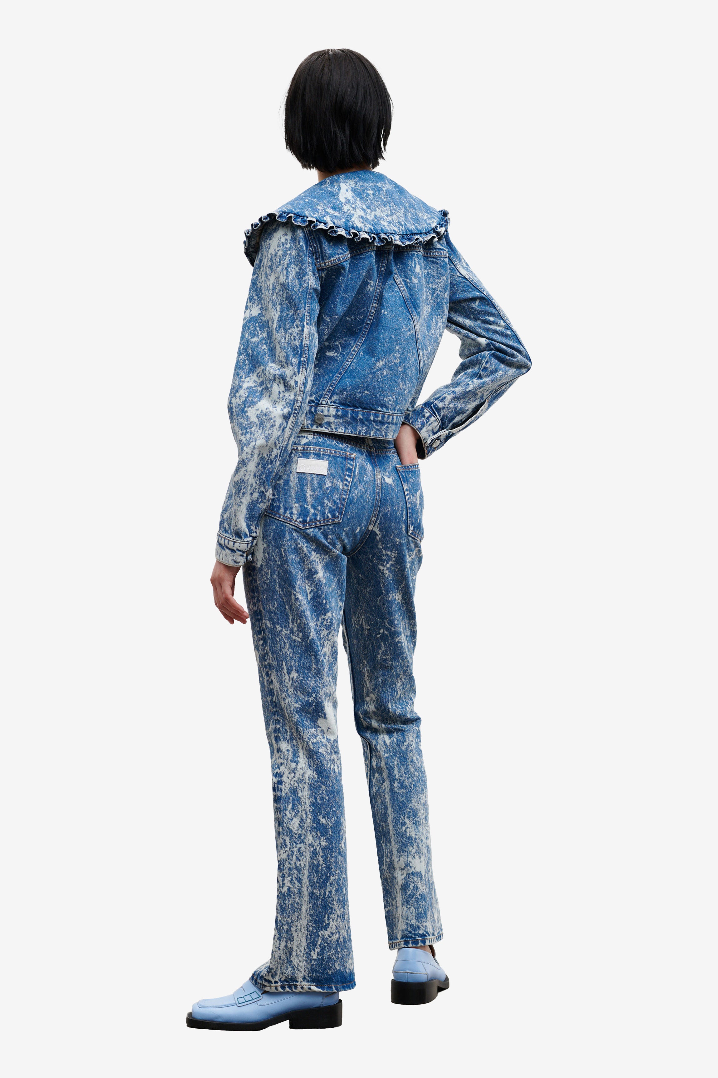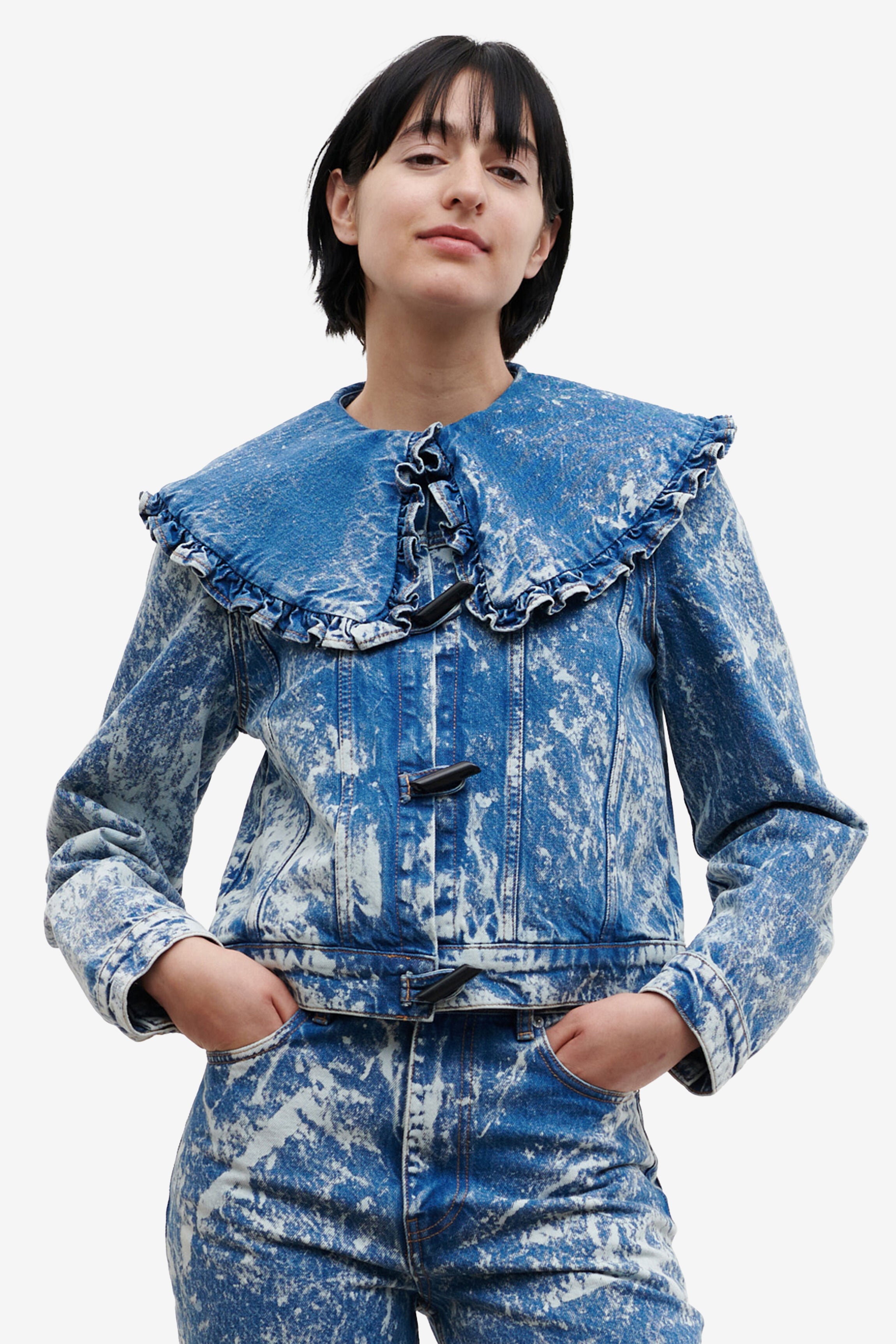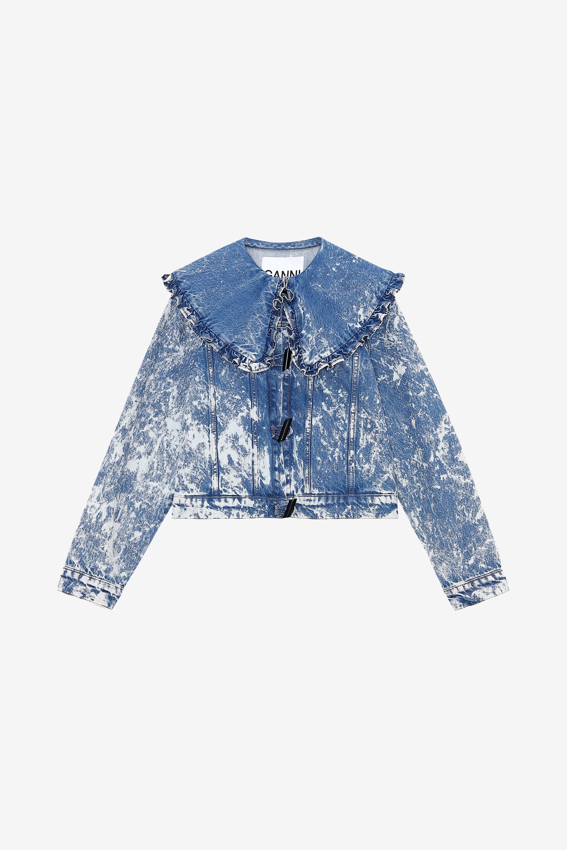 來自丹麥的 GANNI 以活潑趣味的服裝出名。這款牛仔外套的大領片配上荷葉飾邊充滿 GANNI 標誌性元素,漂白洗色丹寧布料讓整體視覺更加搶眼,一眼就能辨識這款選品出自於 GANNI。同款面料另有牛仔褲,隨意組成整套亮眼穿搭。
