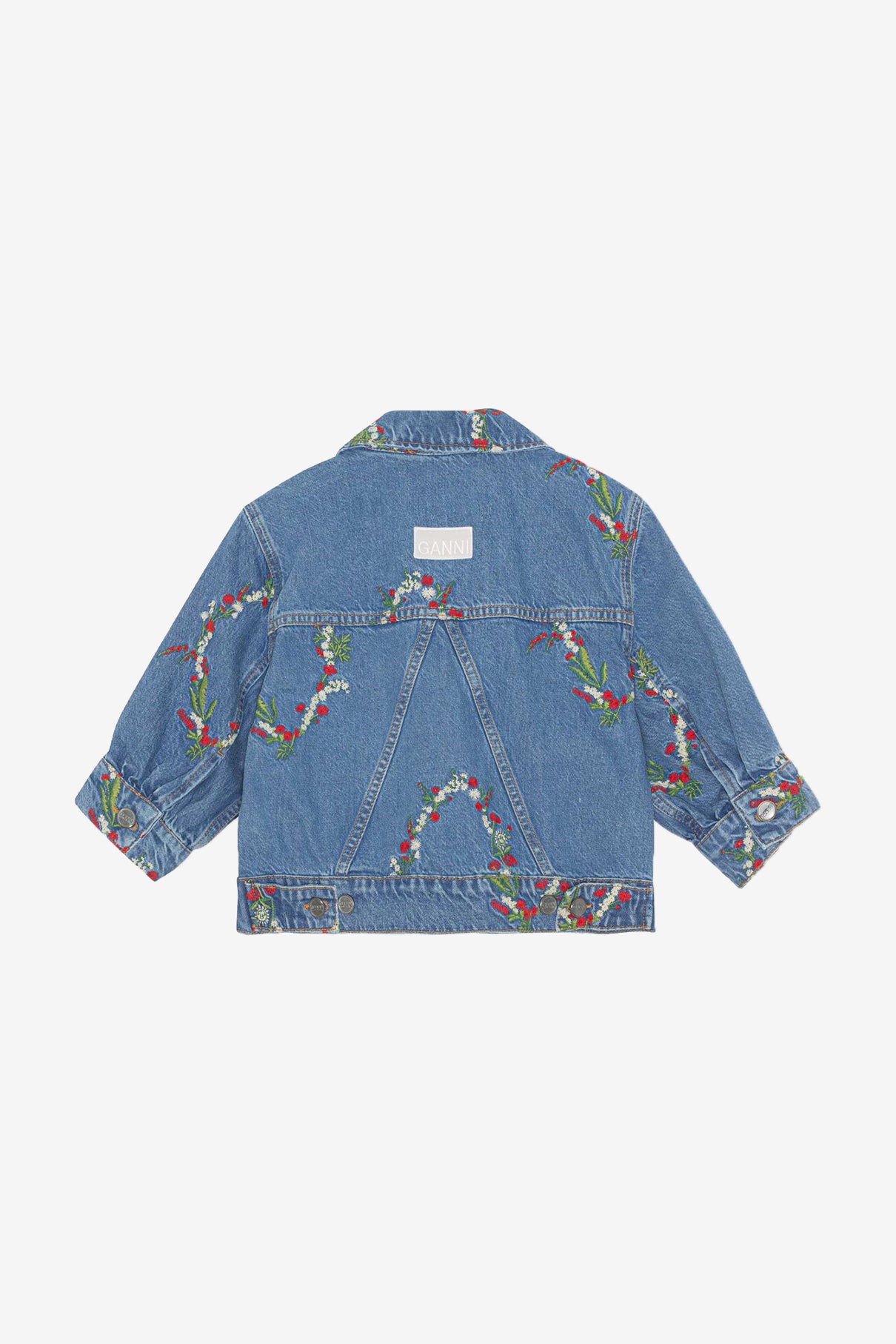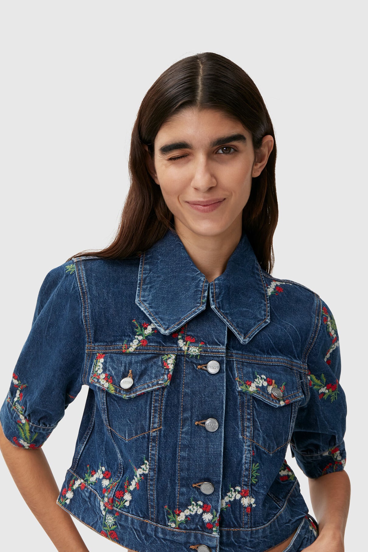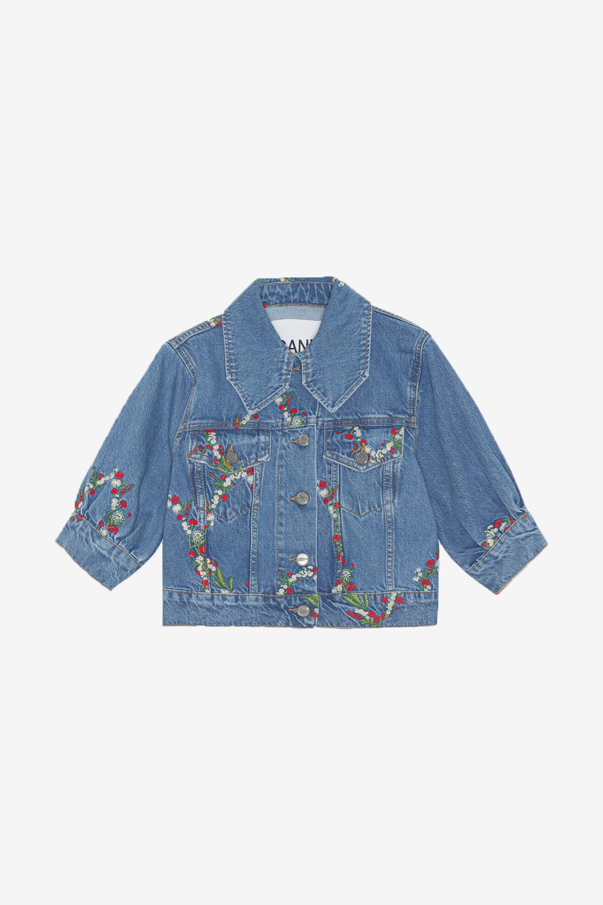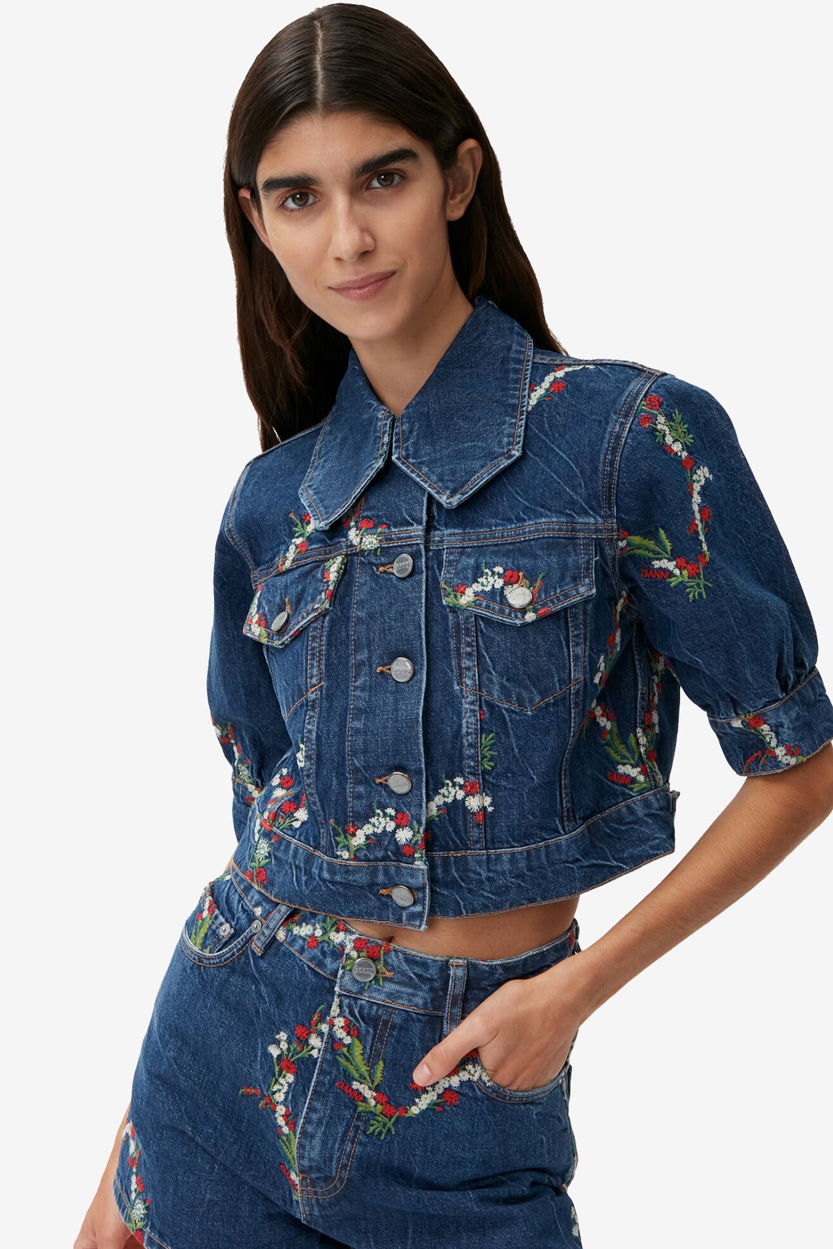 來自丹麥的 GANNI 以活潑趣味的服裝出名。這款牛仔外套重點在活潑的刺繡花卉,短版版型搭配菱形領片與澎袖設計更加青春,背面有 GANNI Logo 標誌,穿上同樣丹寧布料的 Mini Denim Shorts,組成名副其實的 GANNI Girls 風格!