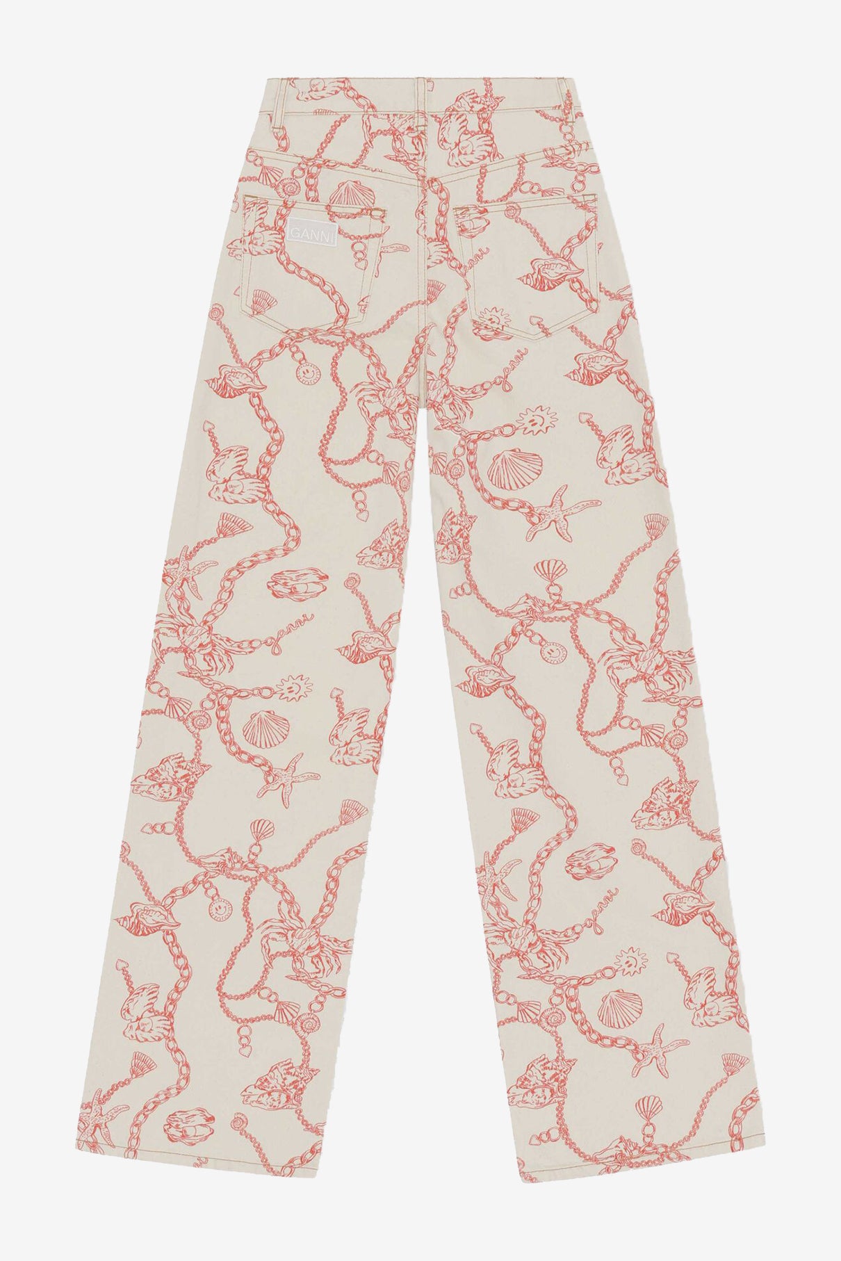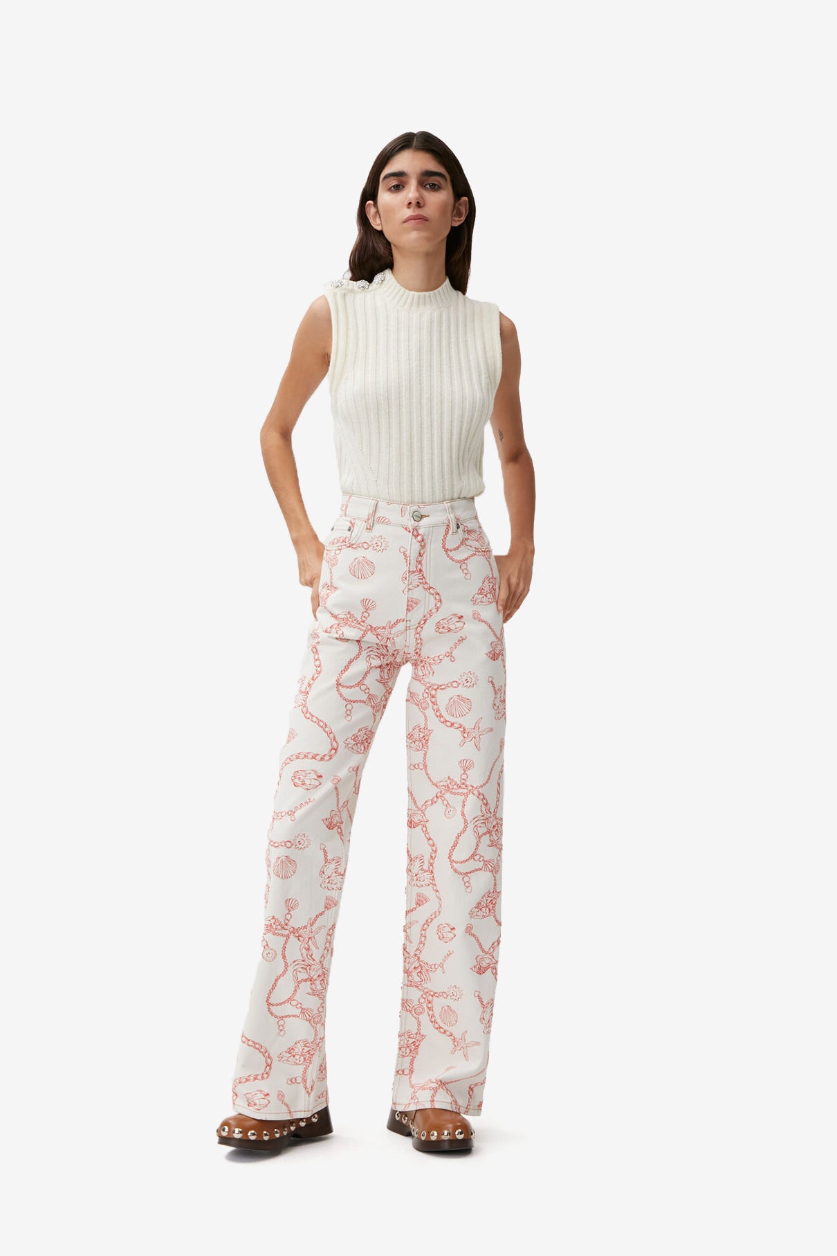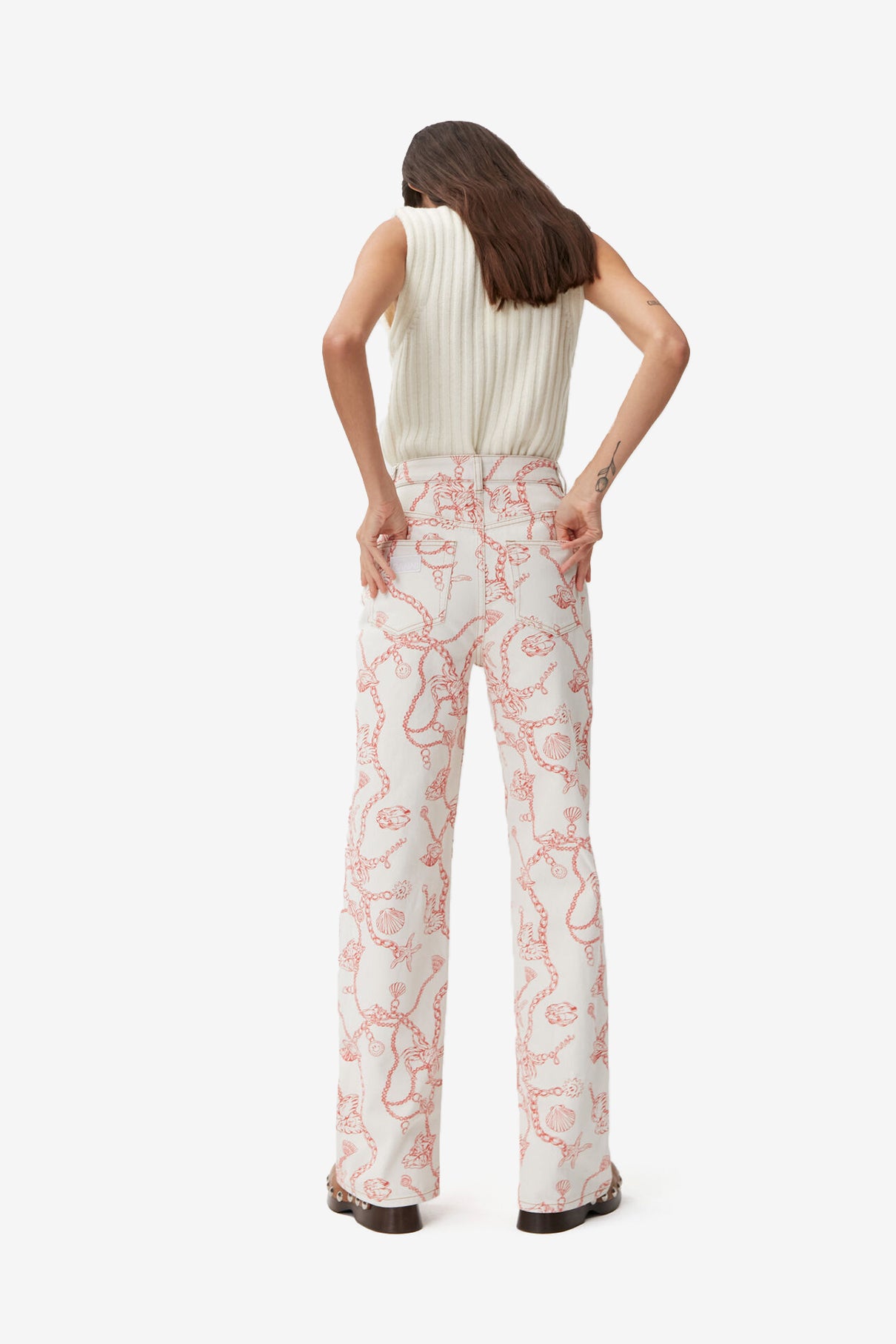 來自丹麥的 GANNI 向來運用鮮艷的色彩、實驗性的搭配帶給人樂觀和正面的品牌形象。Magny 牛仔褲是 GANNI 的經典款式,版型為高腰剪裁、直筒闊腿,穿上簡約修身,再配上獨有海洋風格印花,不管是素色或是個性風格的上衣皆可駕馭。左後臀口袋有 GANNI Logo 標誌。另有相同印花 Mini Print Denim Skirt 可選擇。