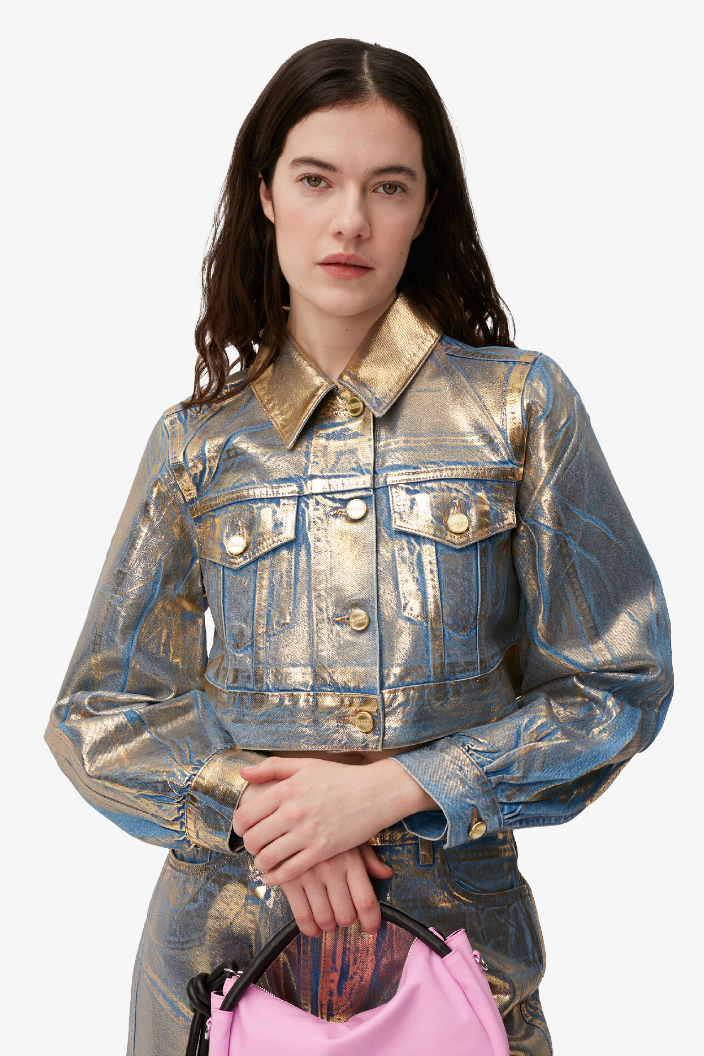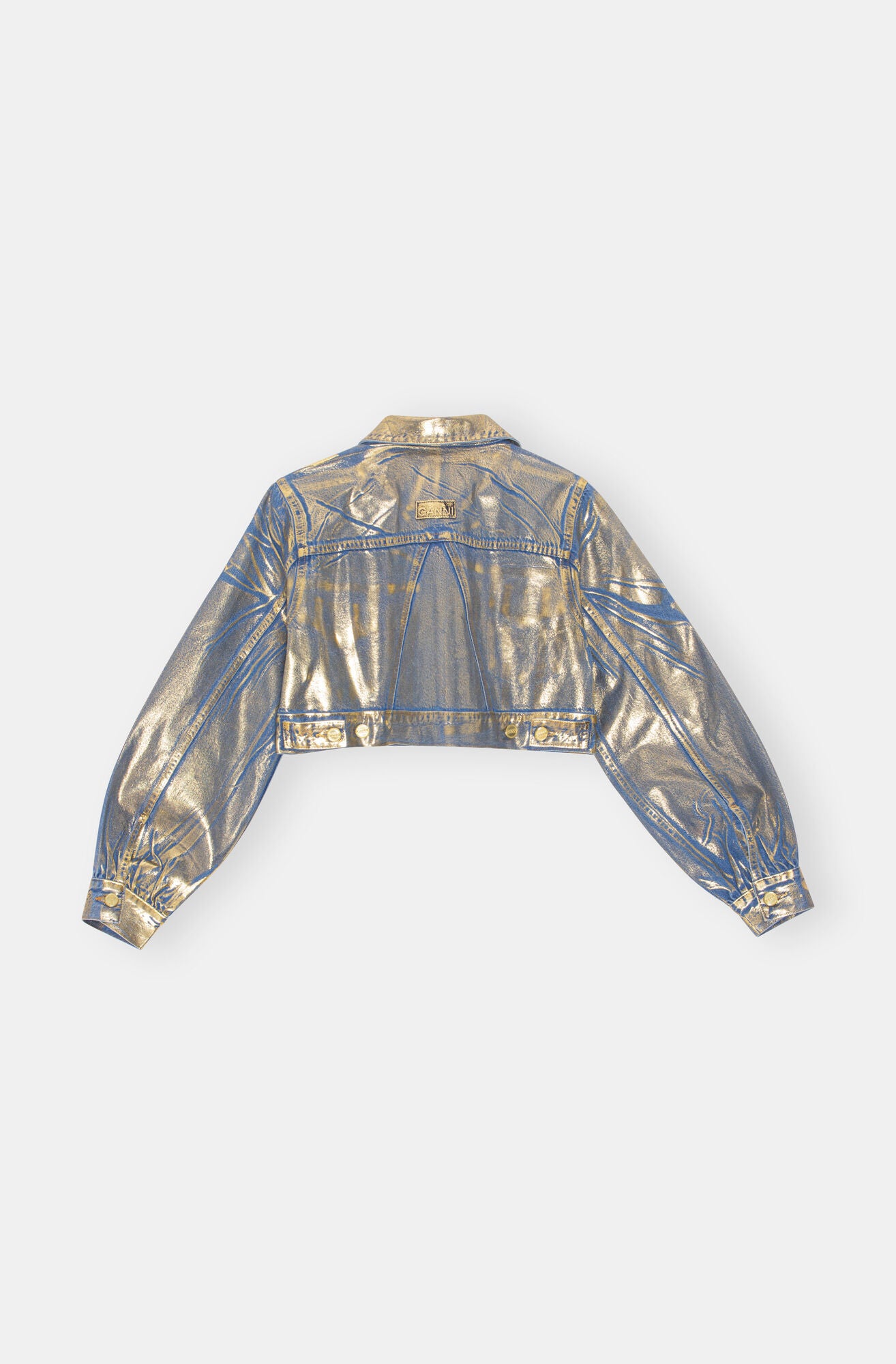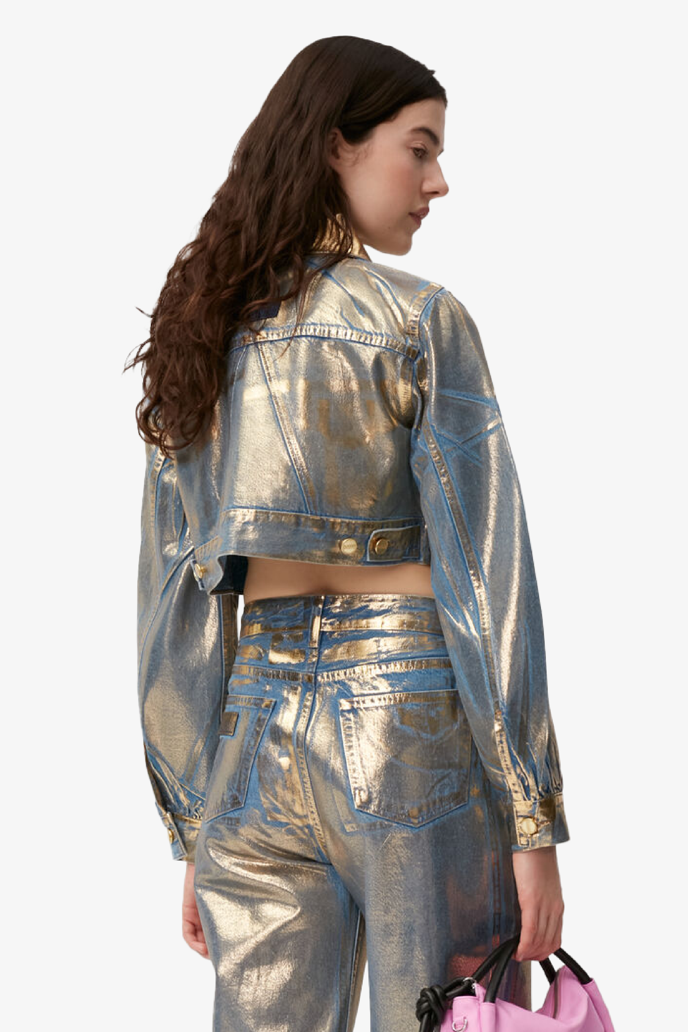 GANNI 將經典的丹寧外套重新演繹。外套採方形俐落剪裁,以藍色丹寧點綴金色閃粉,散發迷人光澤感。可搭配 GANNI 的丹寧褲,輕鬆展現摩登與率性並存的風格。