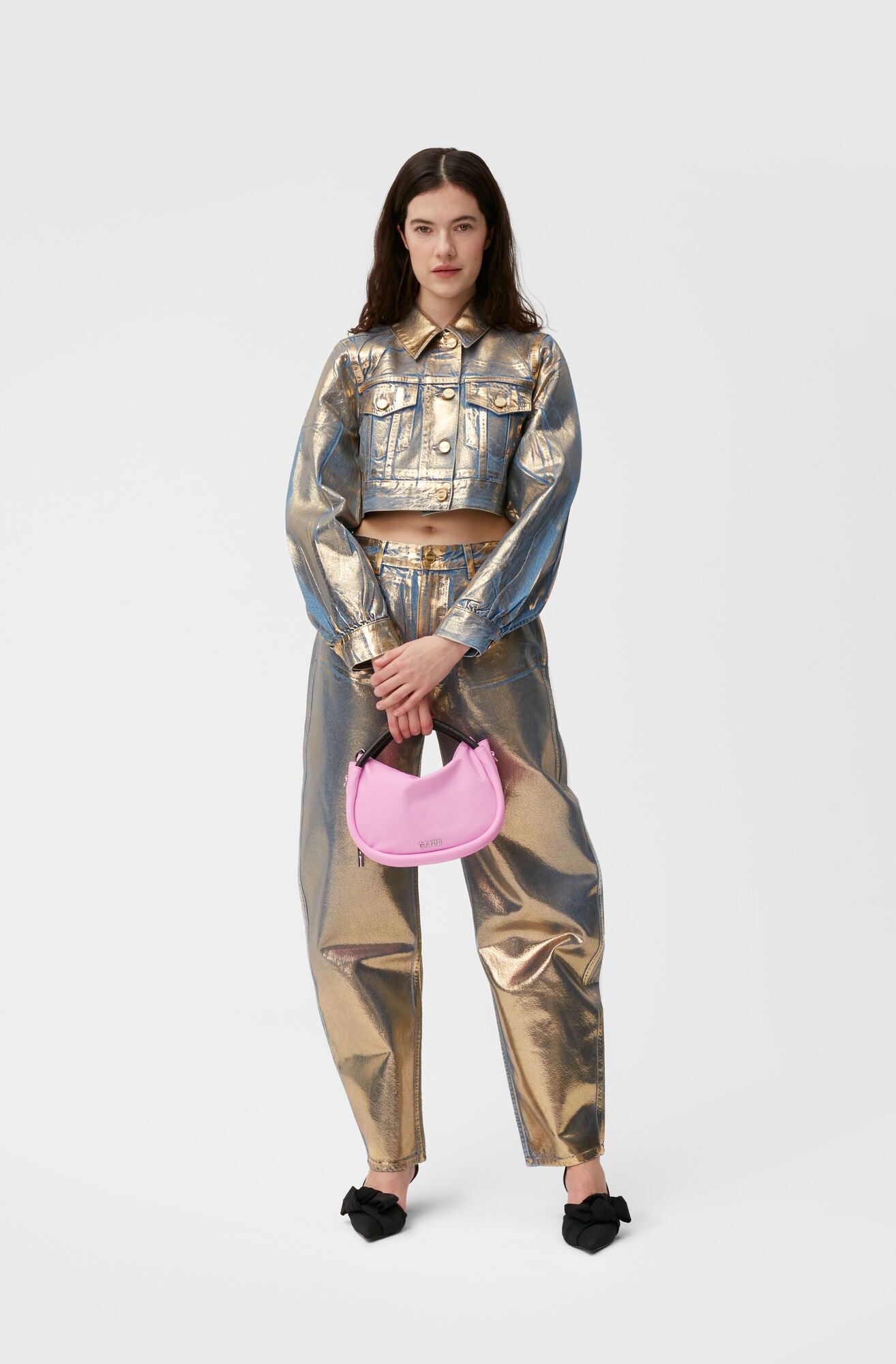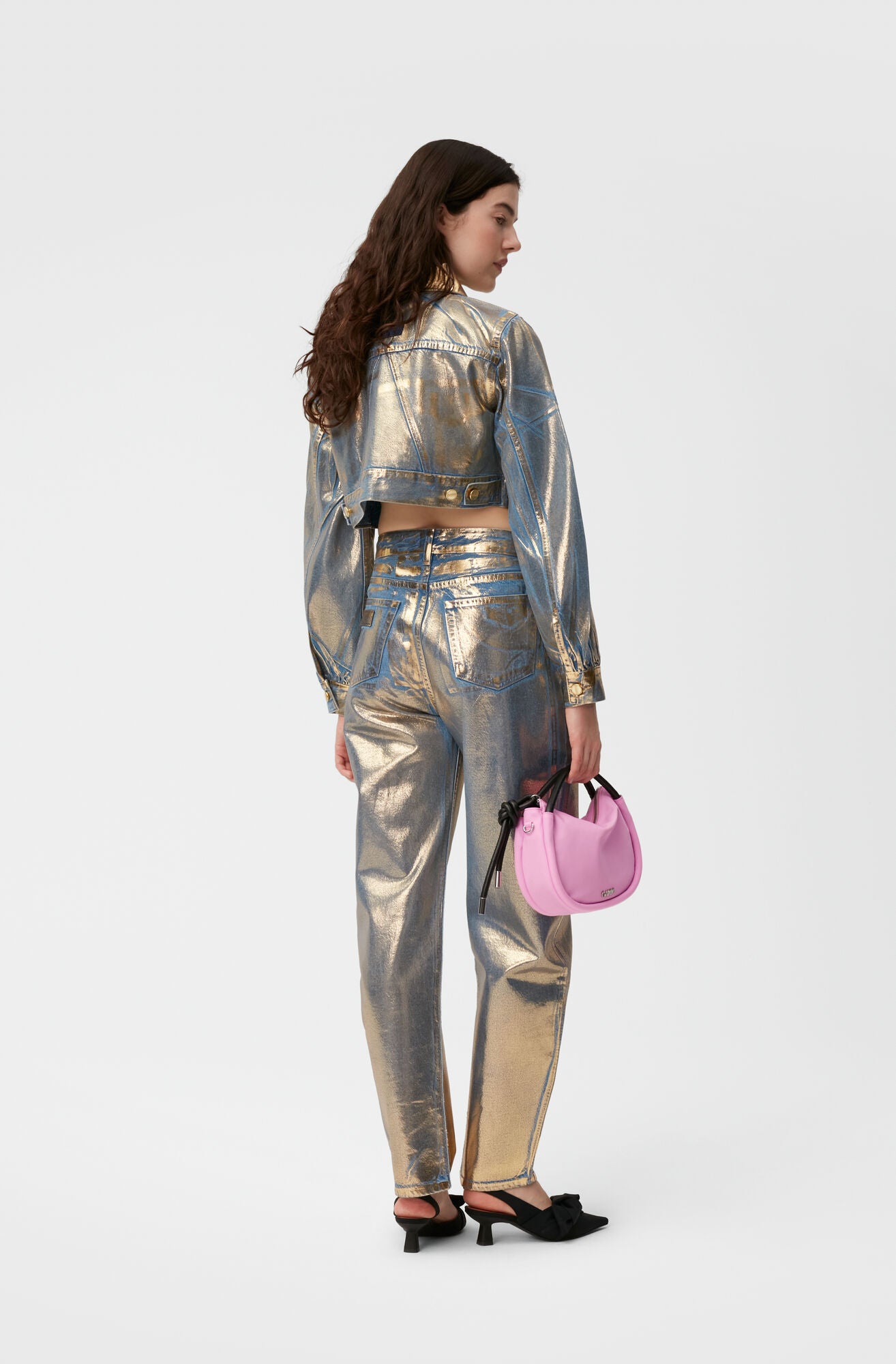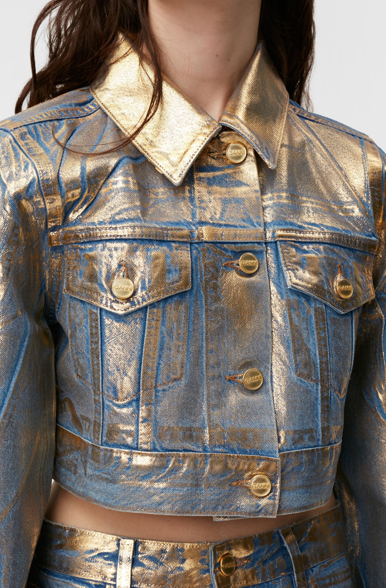 GANNI 將經典的丹寧外套重新演繹。外套採方形俐落剪裁,以藍色丹寧點綴金色閃粉,散發迷人光澤感。可搭配 GANNI 的丹寧褲,輕鬆展現摩登與率性並存的風格。