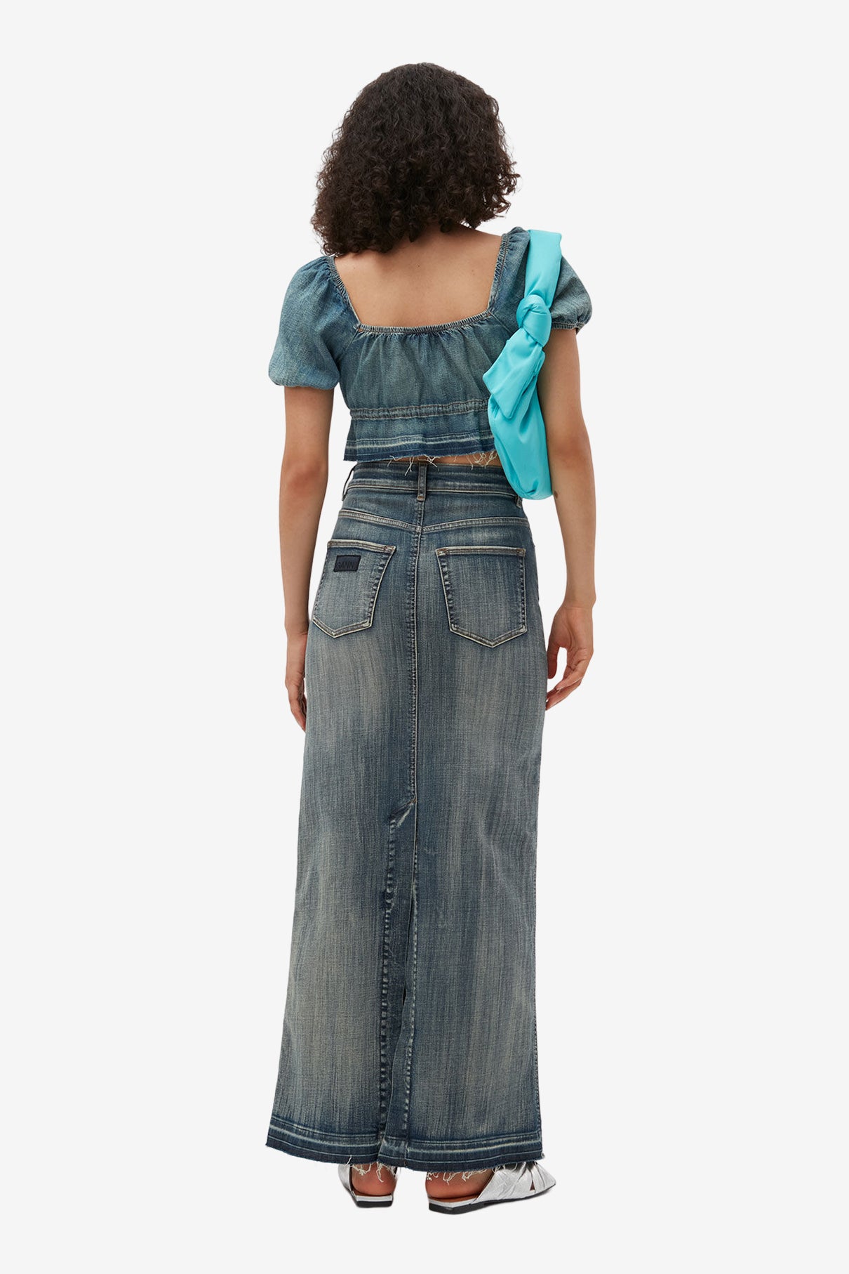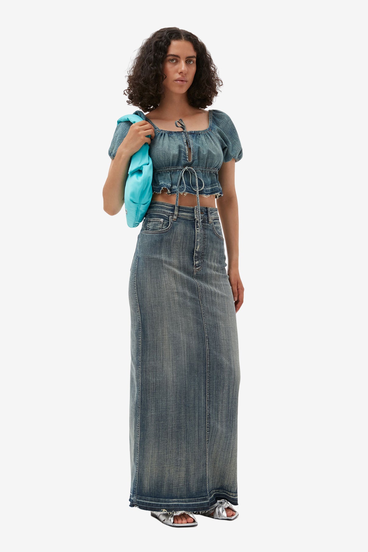 來自丹麥的 GANNI 多元又具特色的設計為丹寧單品創造更多可能!這款丹寧短版上衣使用經認證的有機棉面料,領口和背部皆是方形剪裁,胸前有兩處抽繩,可以自由調整上半身的線條,加上鬆緊邊緣的澎澎袖,成為時髦清爽又染色特殊的牛仔選品。可與 Tint Edge Denim Maxi Skirt 搭配成套。