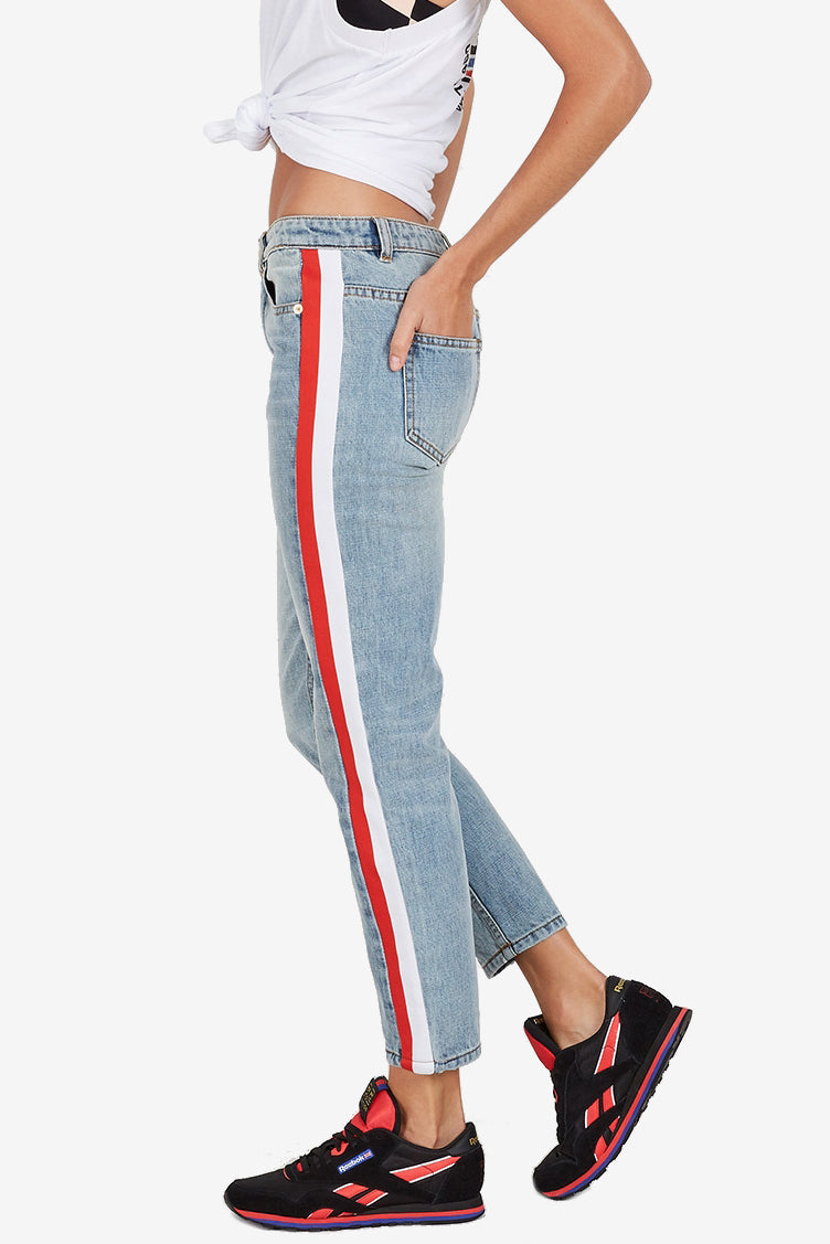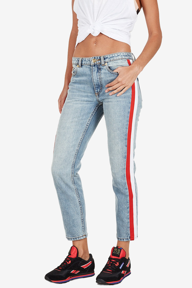P.E NATION的 Alley-Oop 牛仔褲將經典的牛仔褲加上了帶有運動風的復古細節,搭配修身的剪裁及水洗牛仔布的仿舊感,讓這件牛仔褲成為夏天運動風造型的完美選擇。