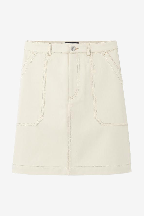 A.P.C. 以高質感的日常必備單品在時尚界成為低調而搶手的品牌。這件牛仔裙採義大利式斜切口袋設計,搭配焦糖色縫線與刻有A.P.C. logo的鈕扣,長度位於膝蓋以上,展現專屬A.P.C. 的活潑氣息。