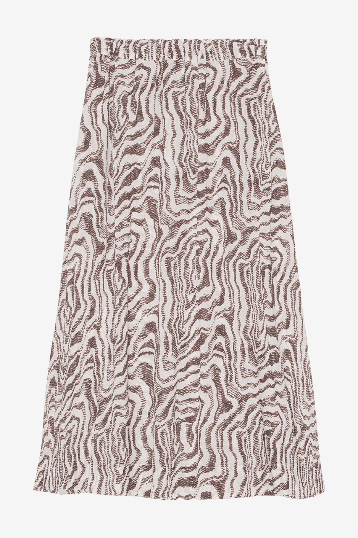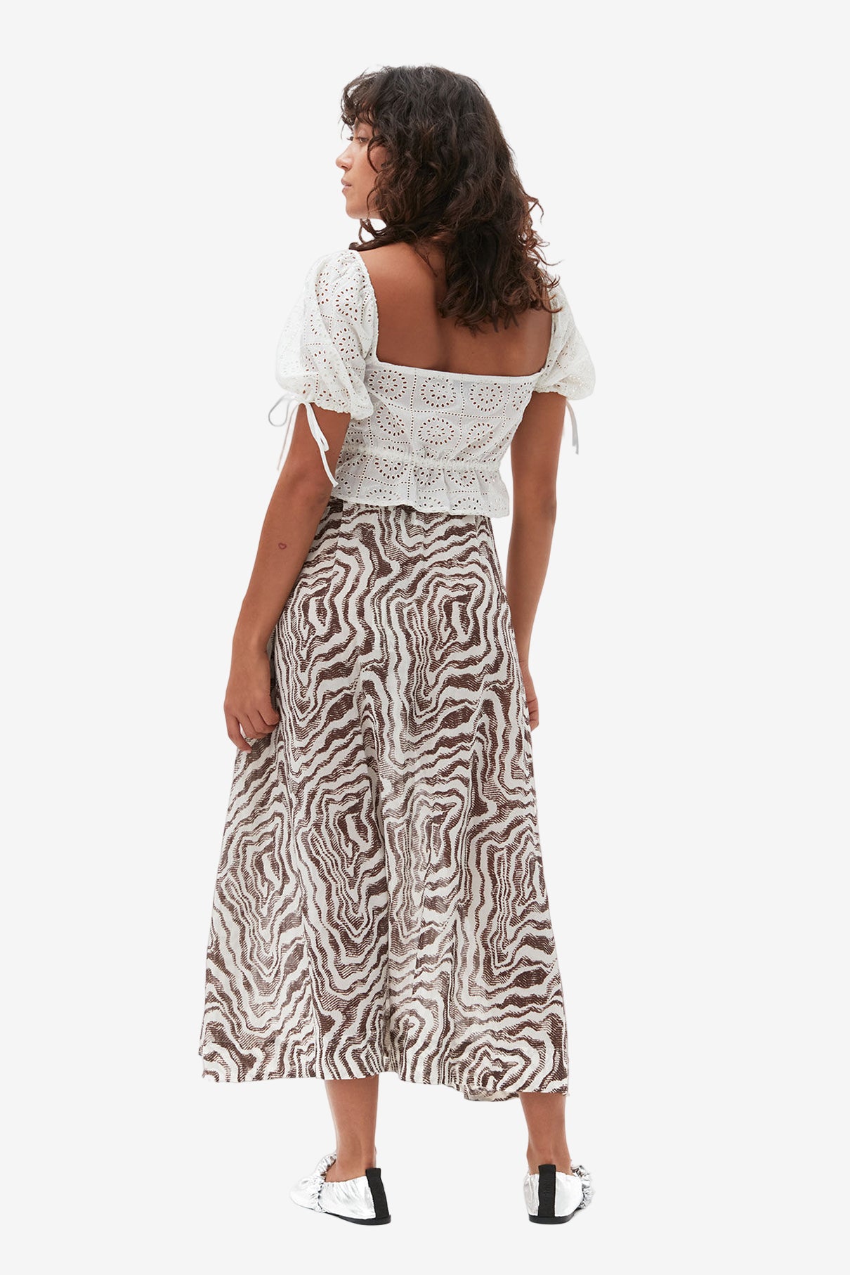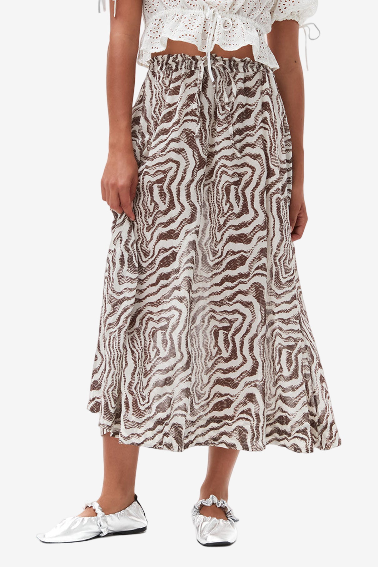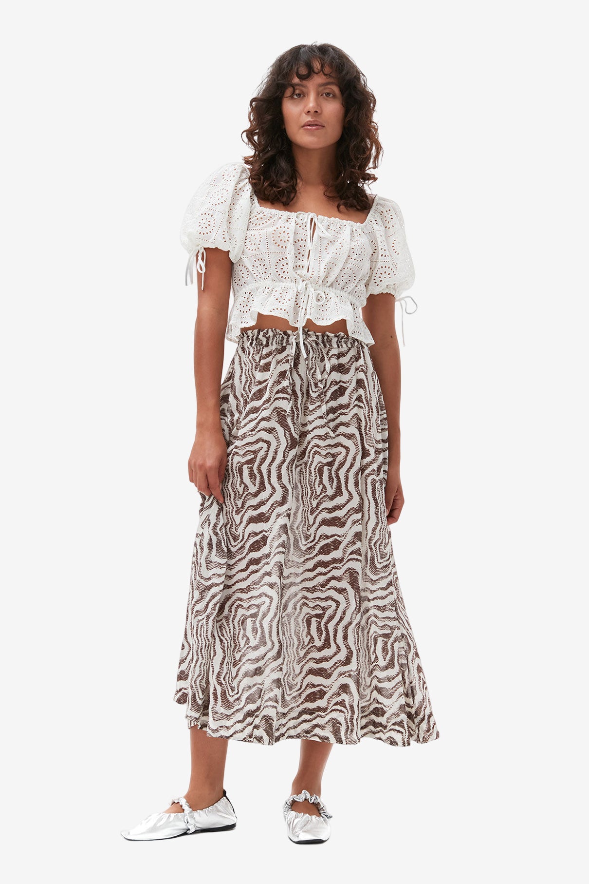 來自丹麥的 GANNI 向來運用鮮艷的色彩、實驗性的搭配帶給人樂觀和正面的品牌形象。這款印花中長裙面料為百分之百經認證的有機棉,是在夏天最想穿的清涼透氣材質,鬆緊腰圍舒適不負擔,推薦搭配上半身 White Broderie Anglaise Cropped Top,完成浪漫飄逸風格。