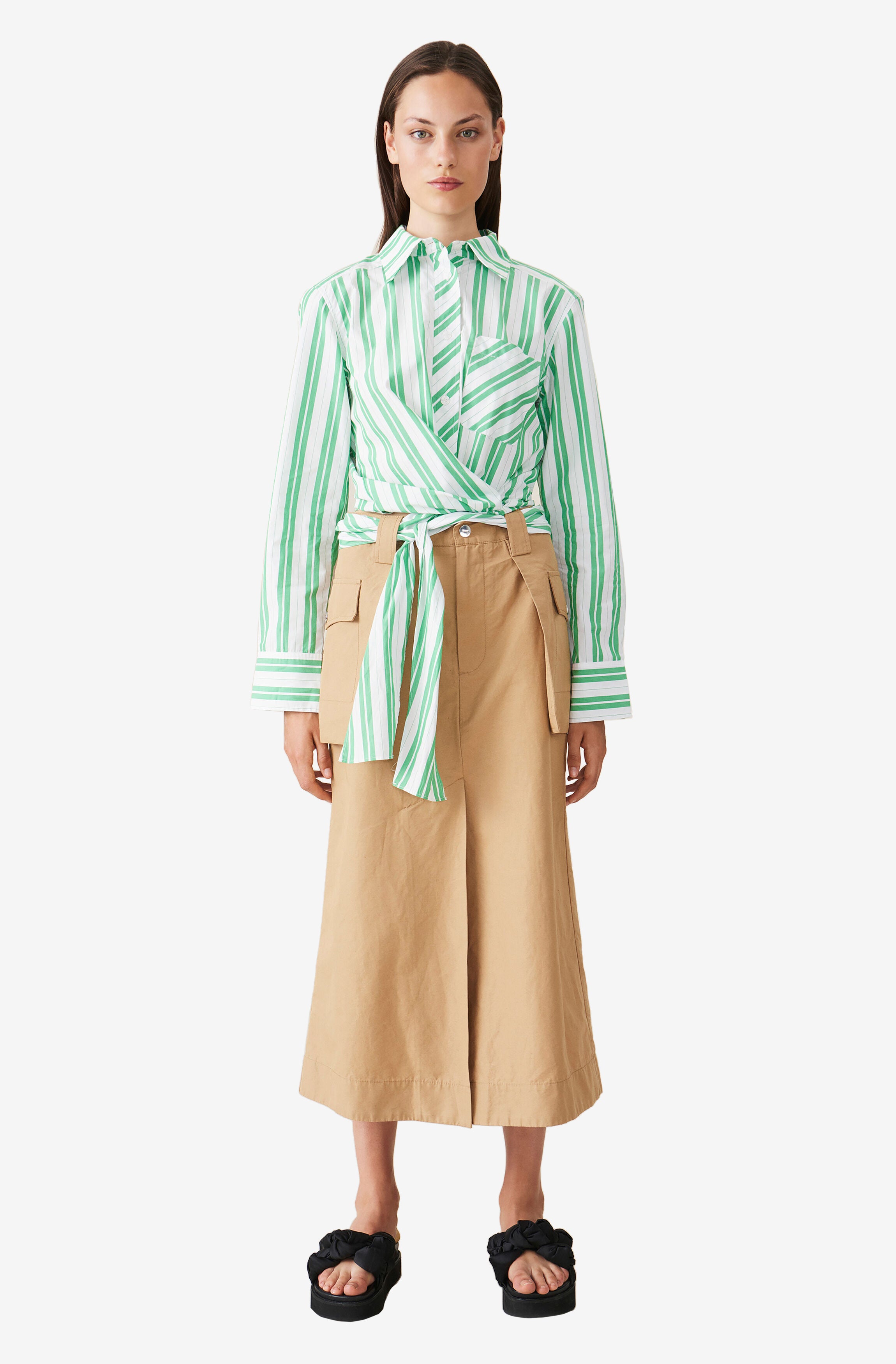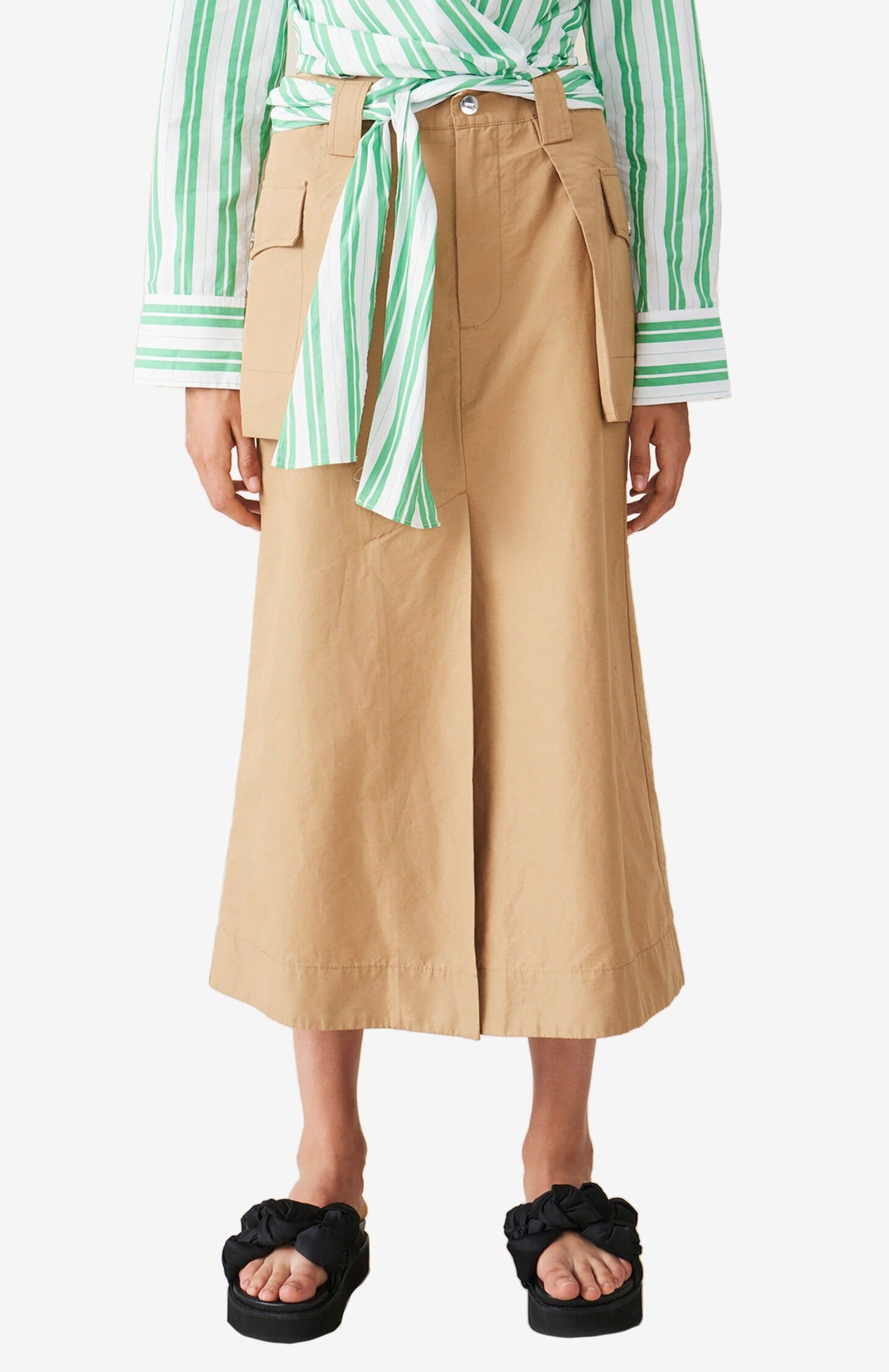 來自丹麥的GANNI以活潑趣味的服裝出名。這件中長裙除了高腰A字剪裁,側邊還有矩形口袋,十分修飾身形。同款布料另有洋裝與長褲。