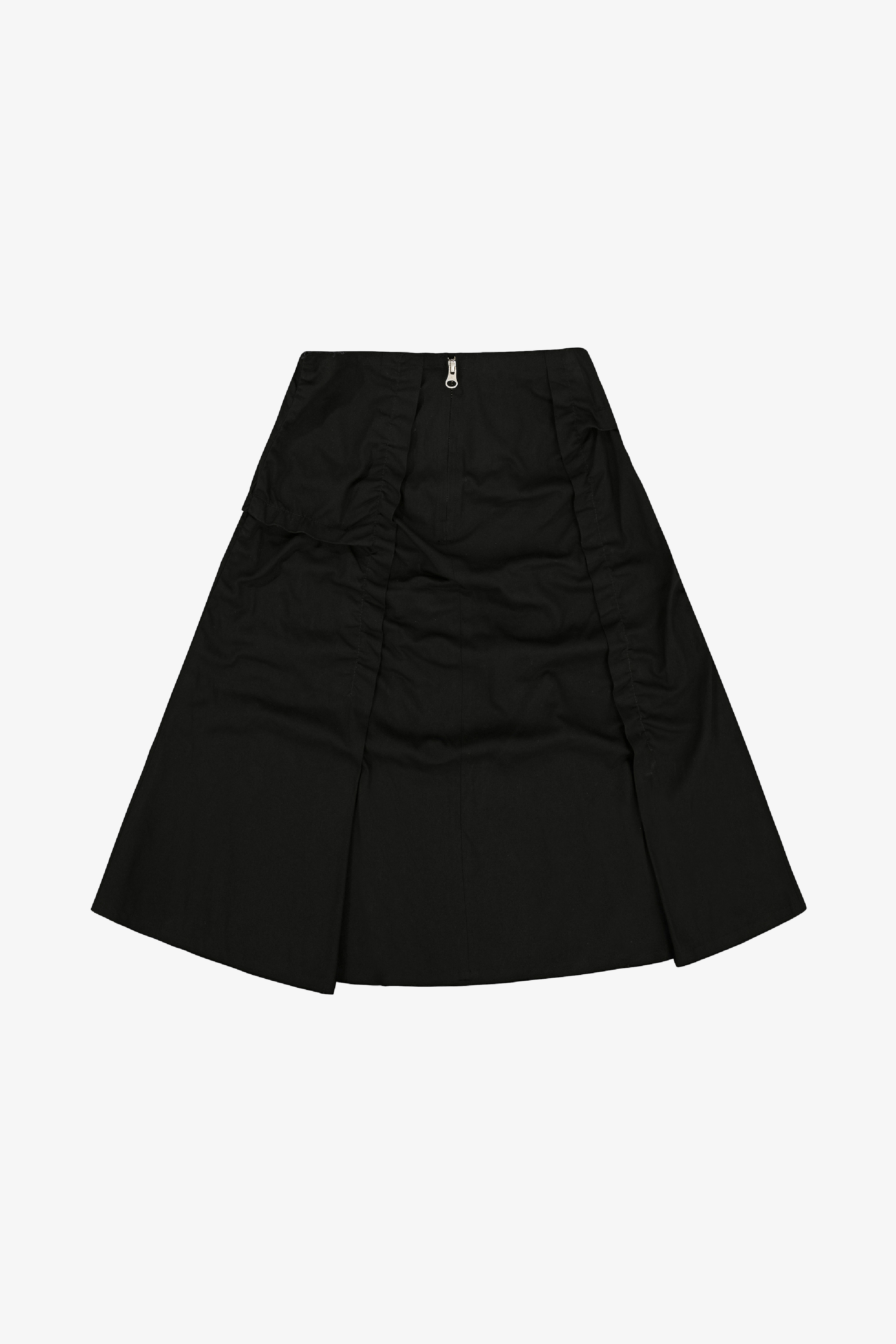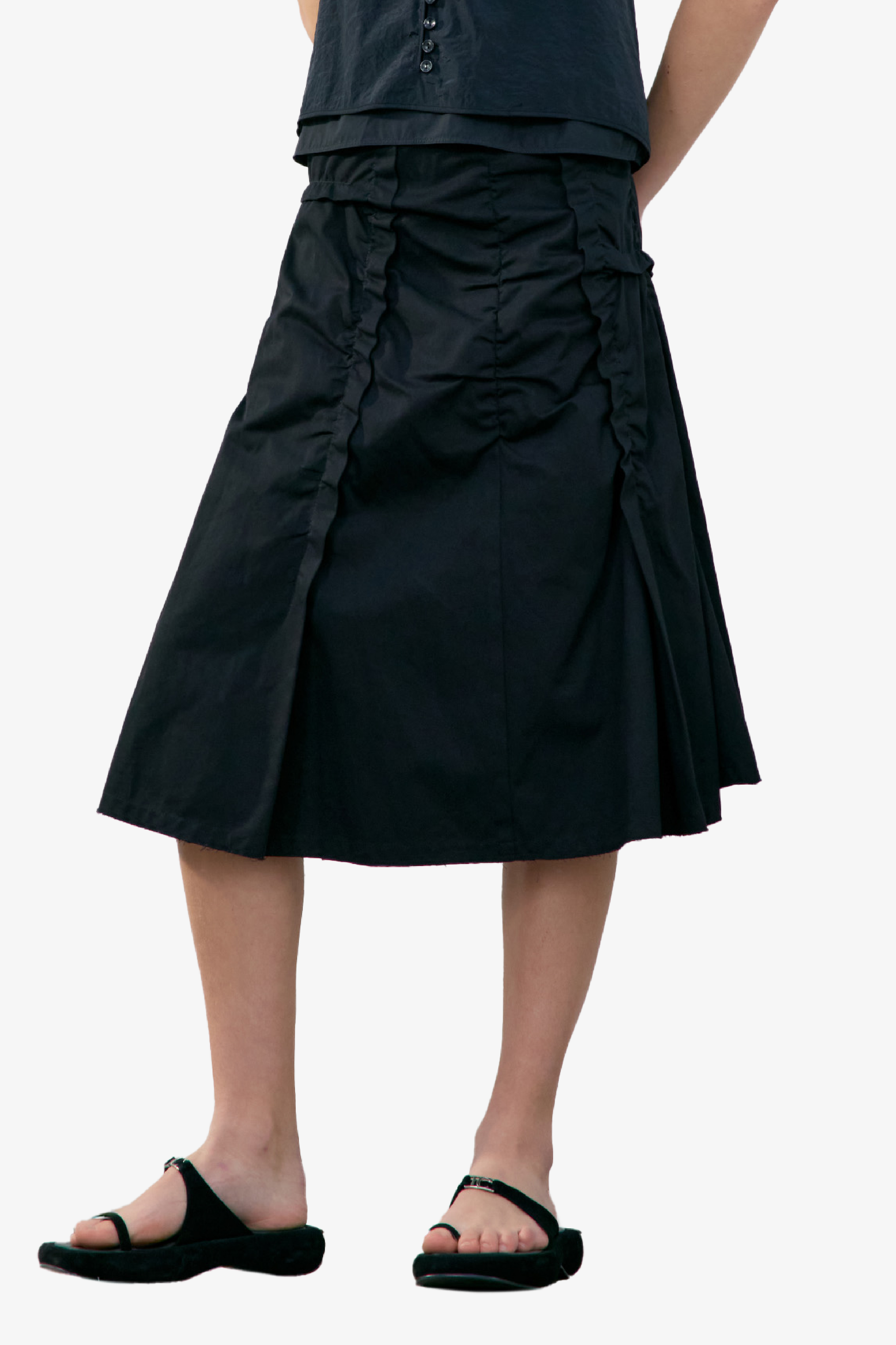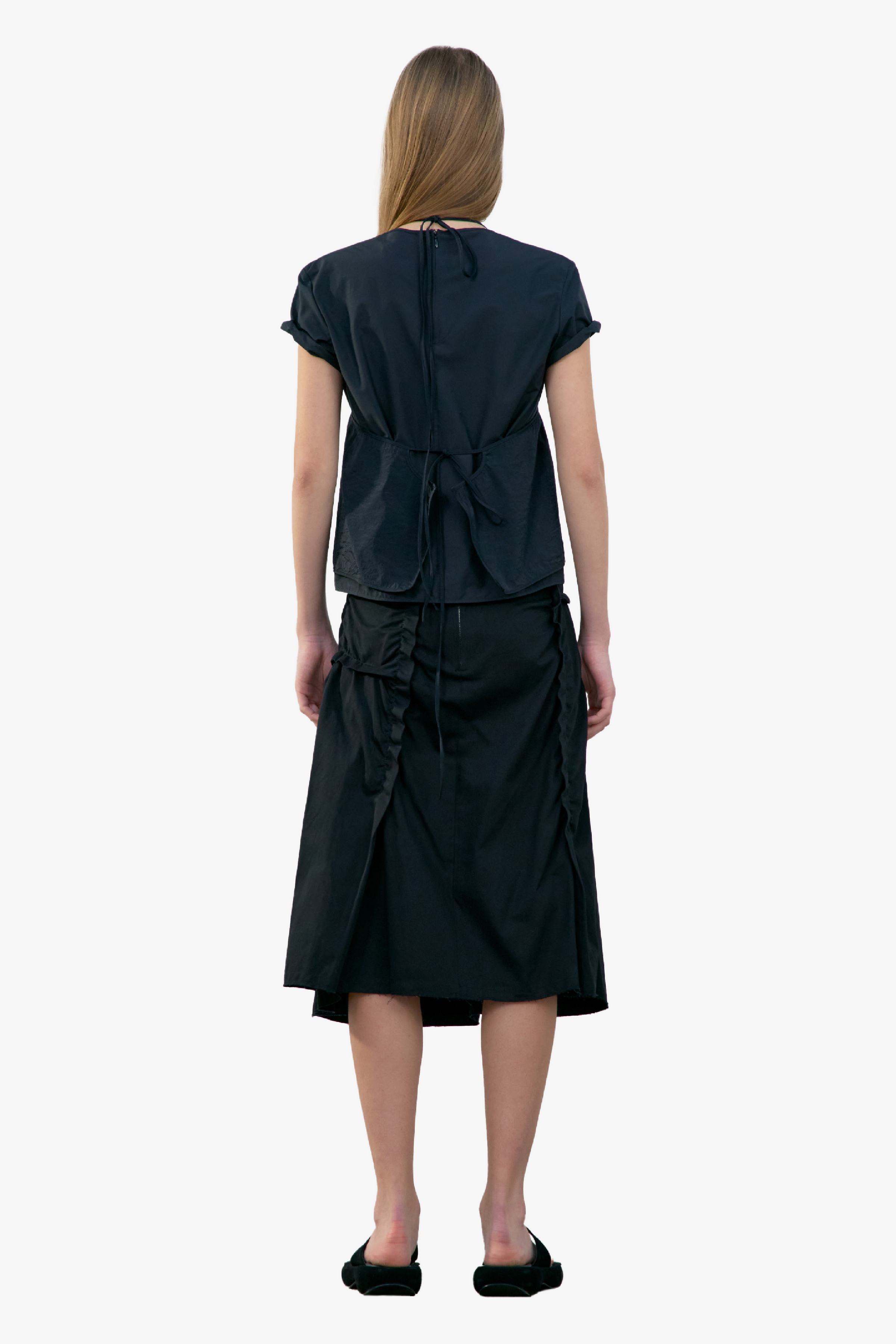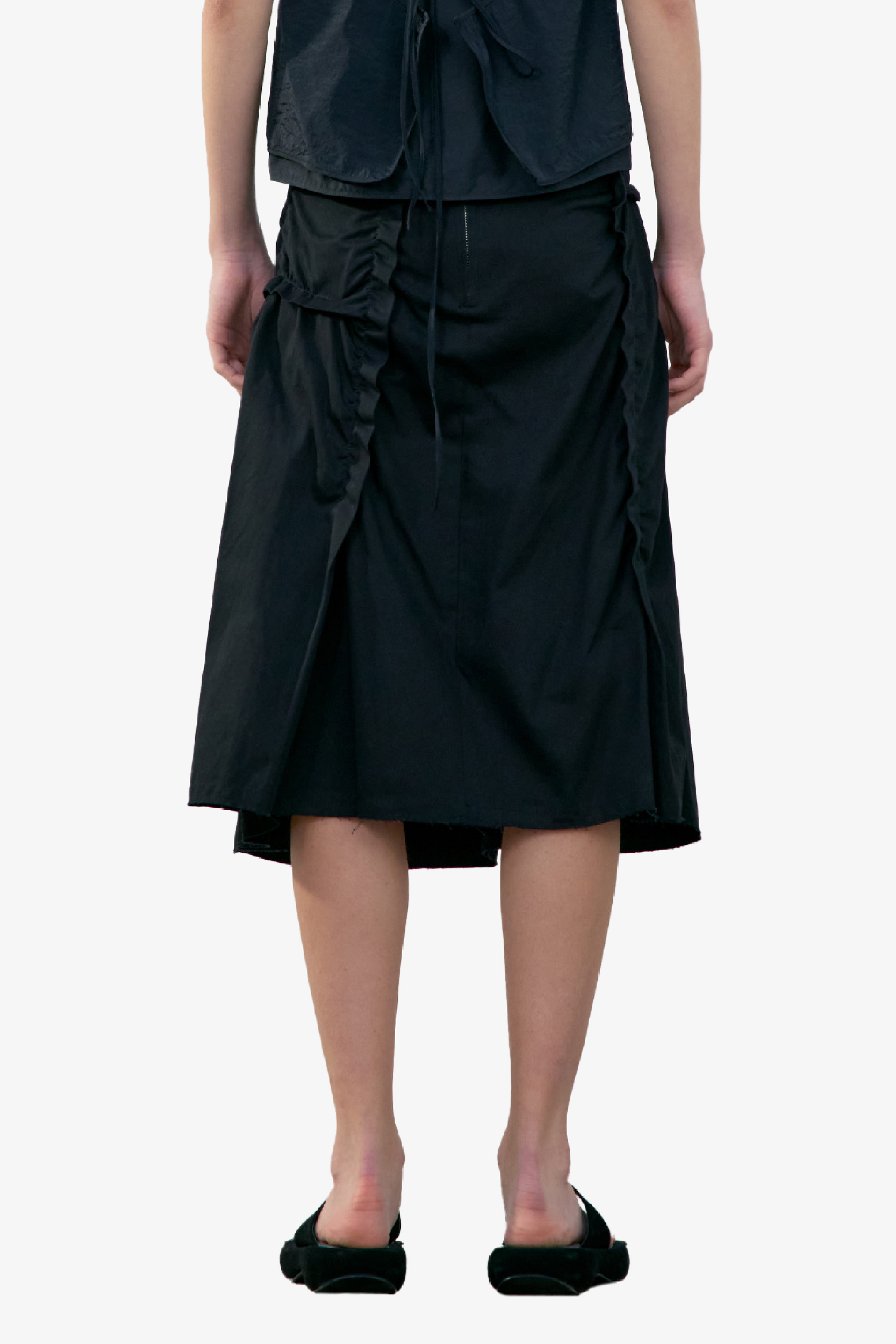 採不對稱抓皺設計,營造層次感與立體感;後側拉鍊設計方便穿脫;下擺則採自然抽鬚剪裁,呈現隨性率性的休閒風格。