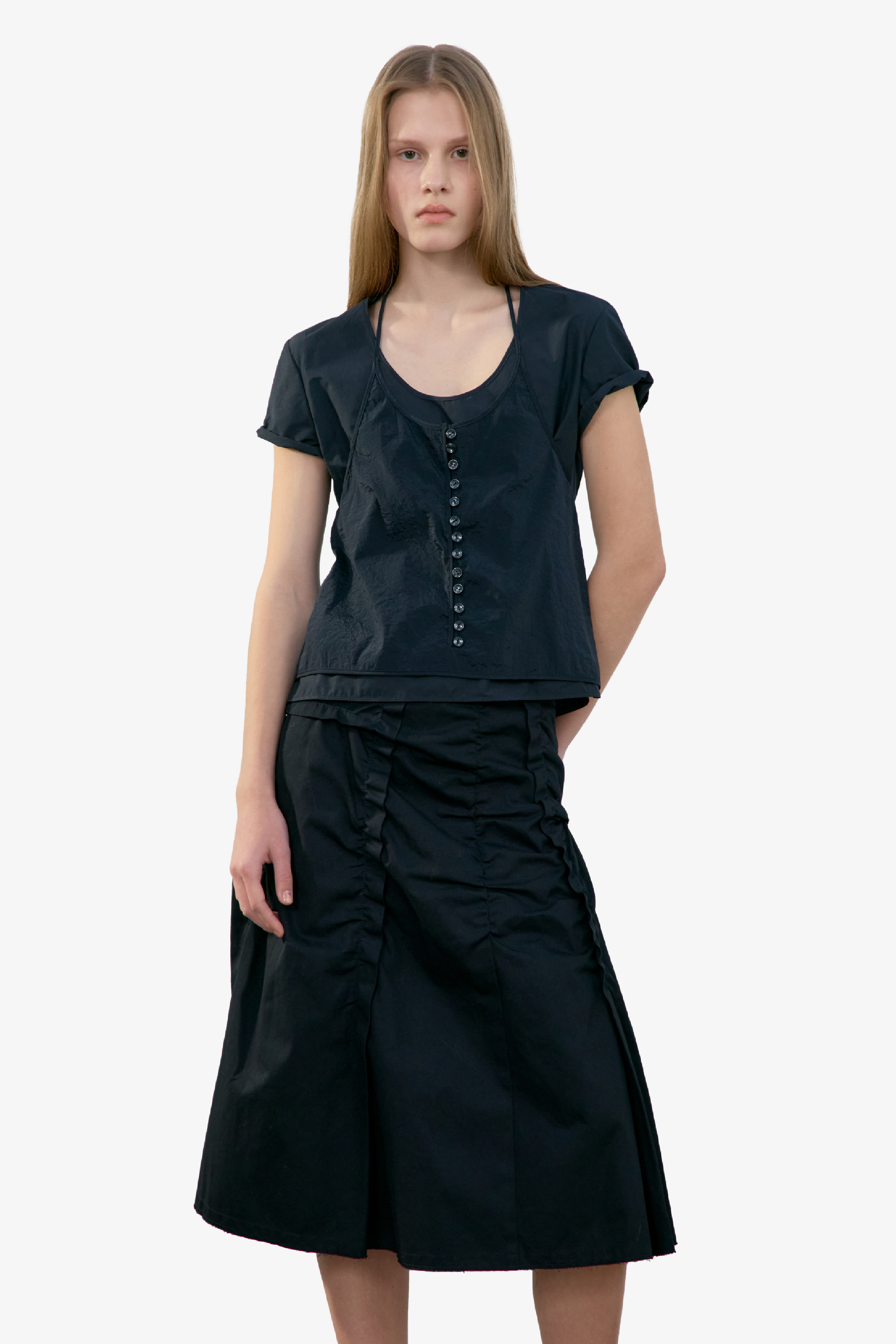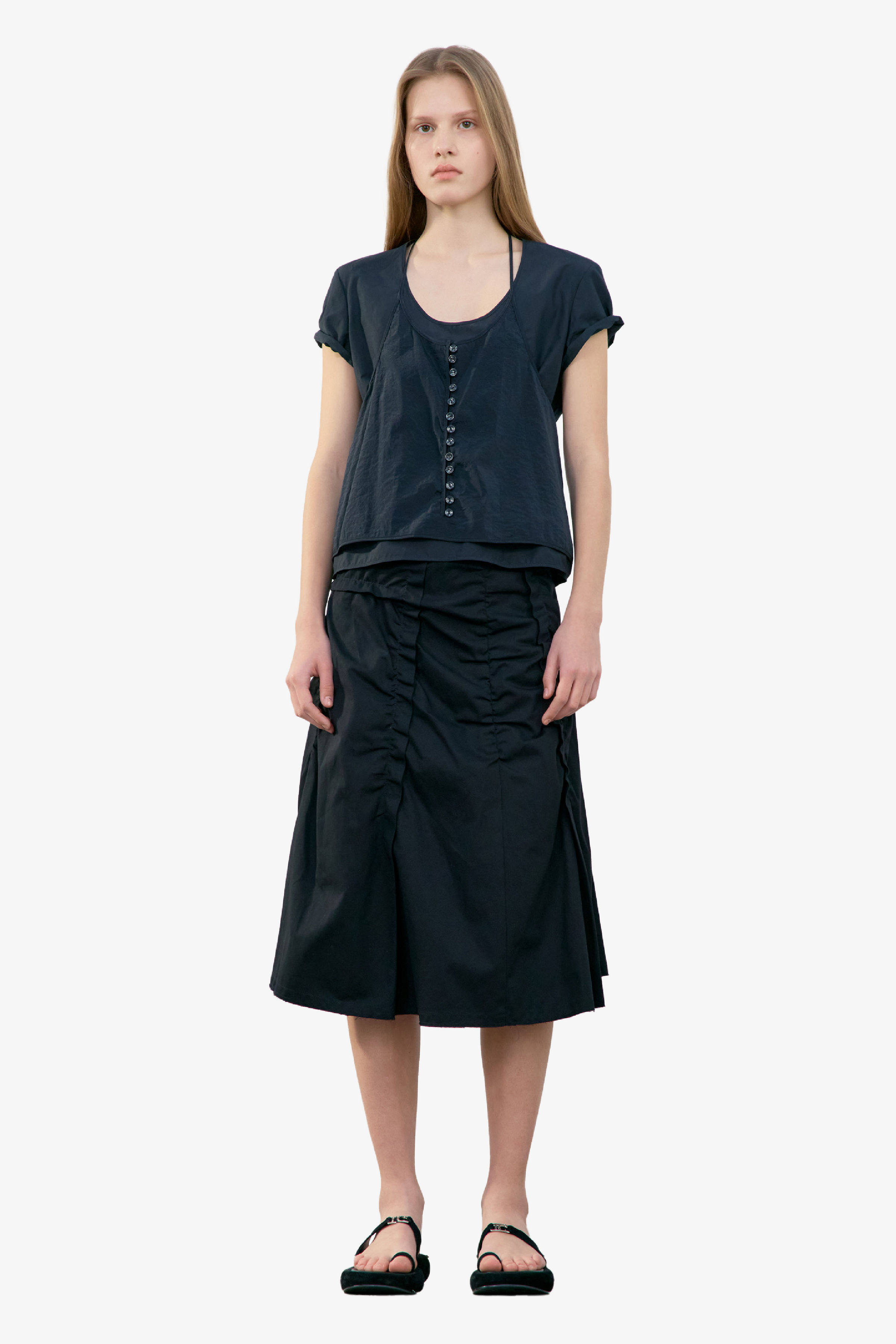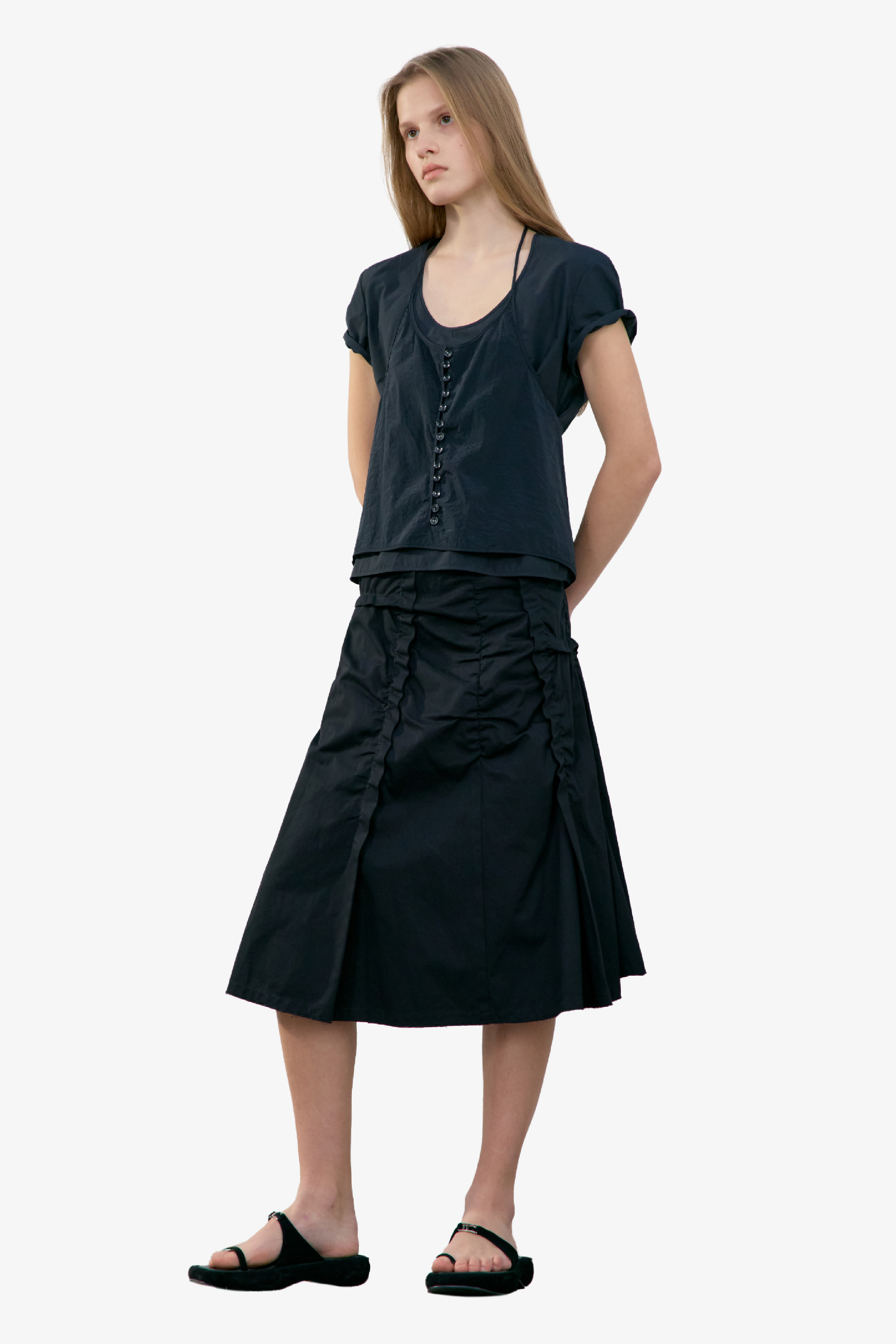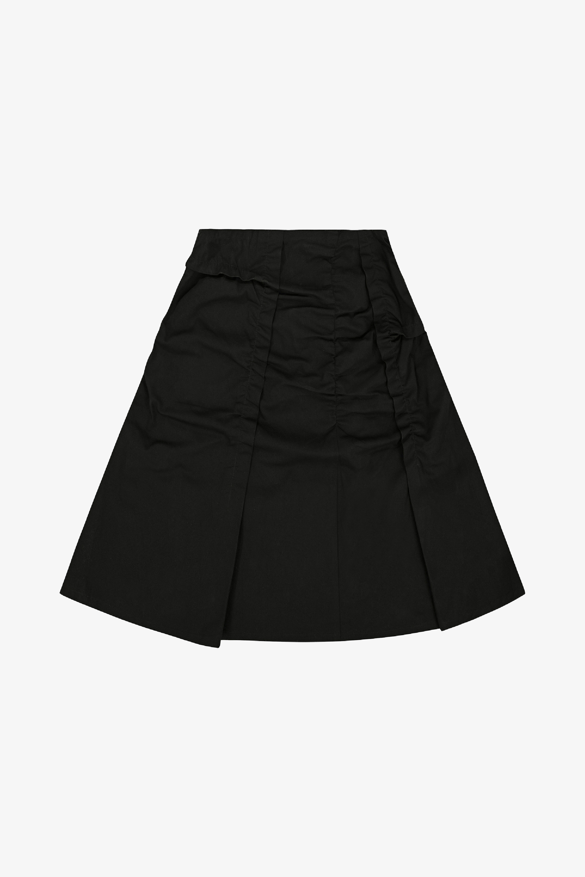 採不對稱抓皺設計,營造層次感與立體感;後側拉鍊設計方便穿脫;下擺則採自然抽鬚剪裁,呈現隨性率性的休閒風格。