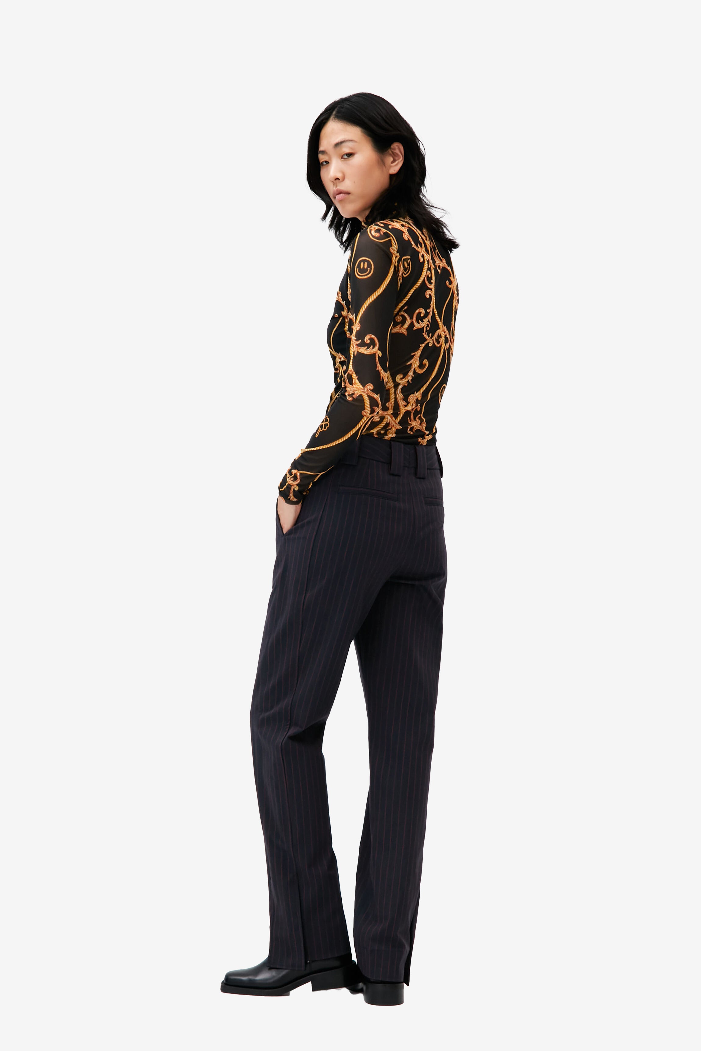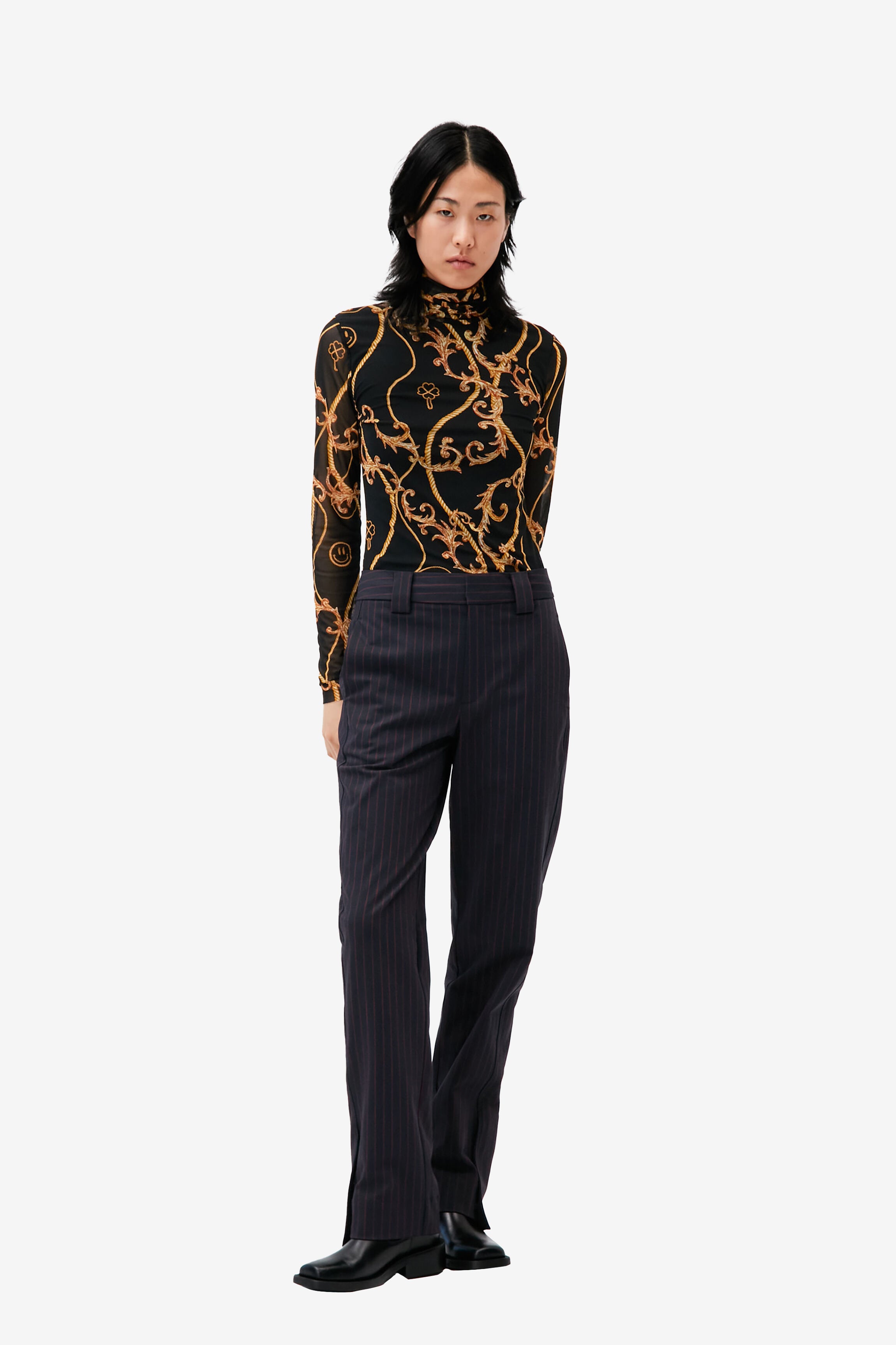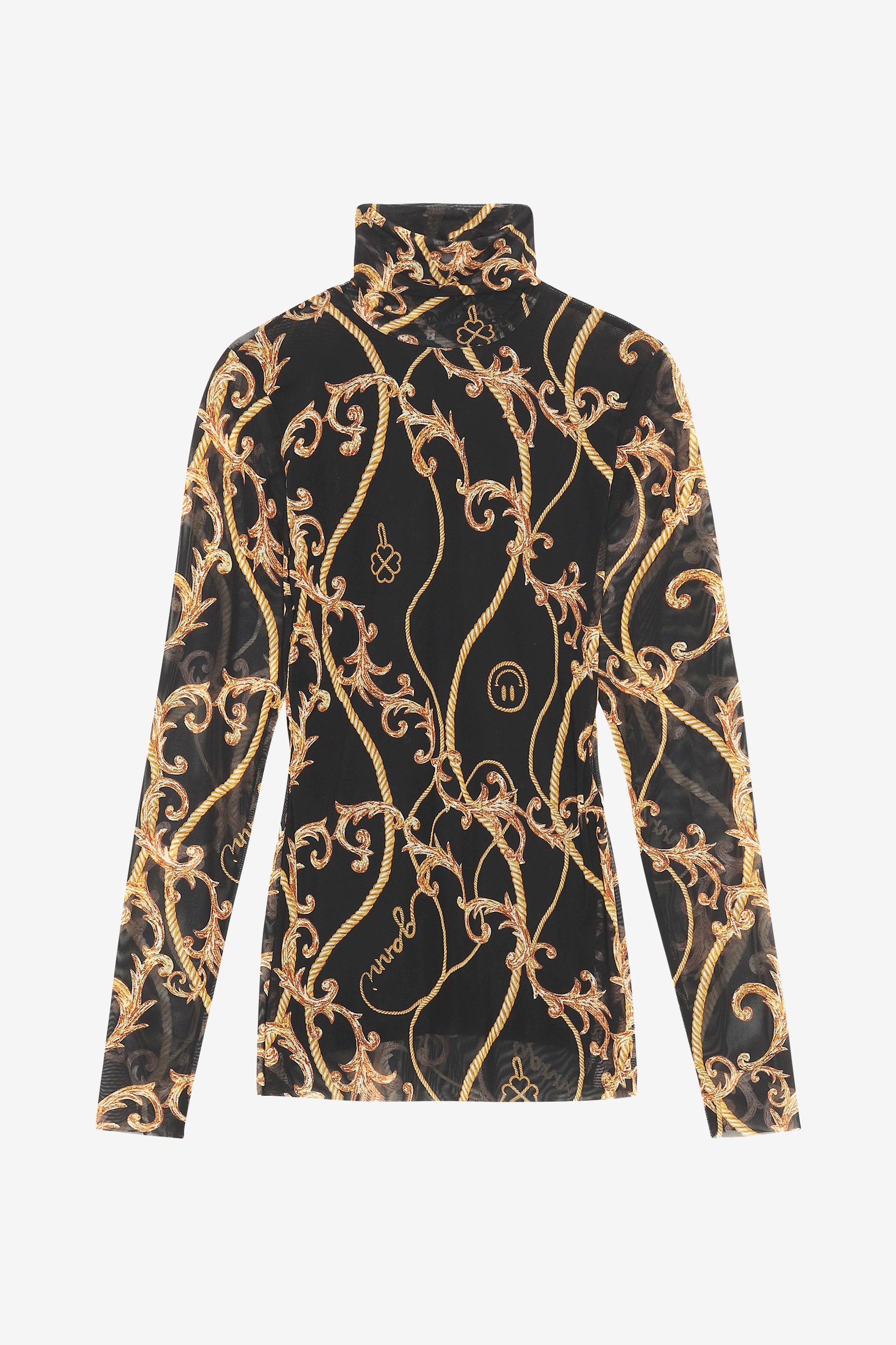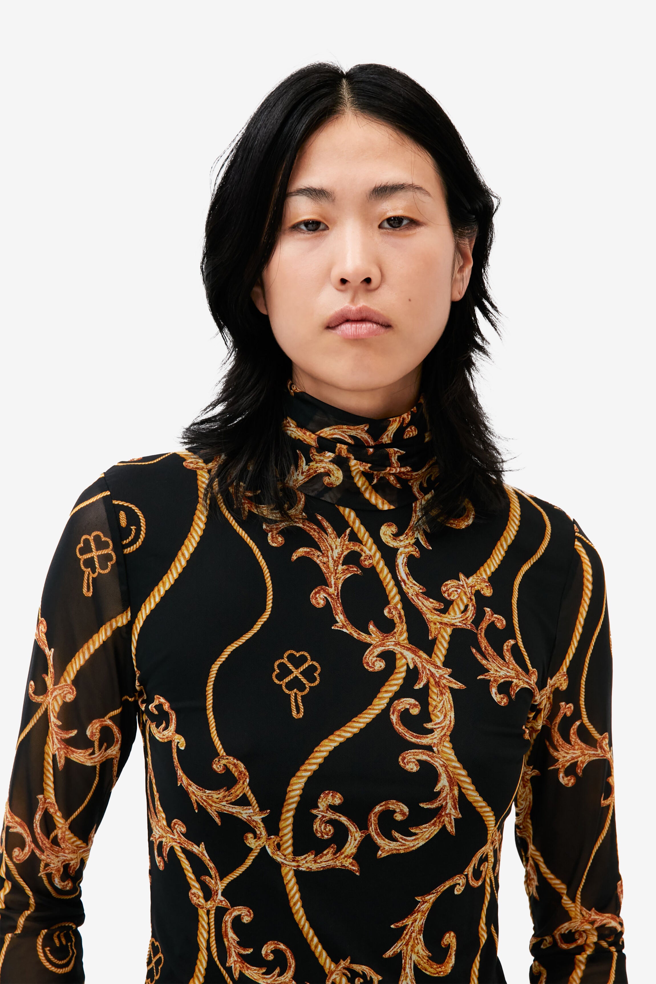 來自丹麥的 GANNI 以活潑趣味的服裝出名。這款高領打底衣採春夏新季印花設計,藏著 GANNI 代表笑臉圖樣,黑底加上黃色印花對比顯眼,柔軟的網眼面料具有彈性,薄透長袖不顯厚重。除了單穿,十分適合再搭配一件外衣,針織衫、洋裝都是展現穿搭功力的絕佳選擇。同款印花另有 V-neck Frill Collar Wide Shirt。