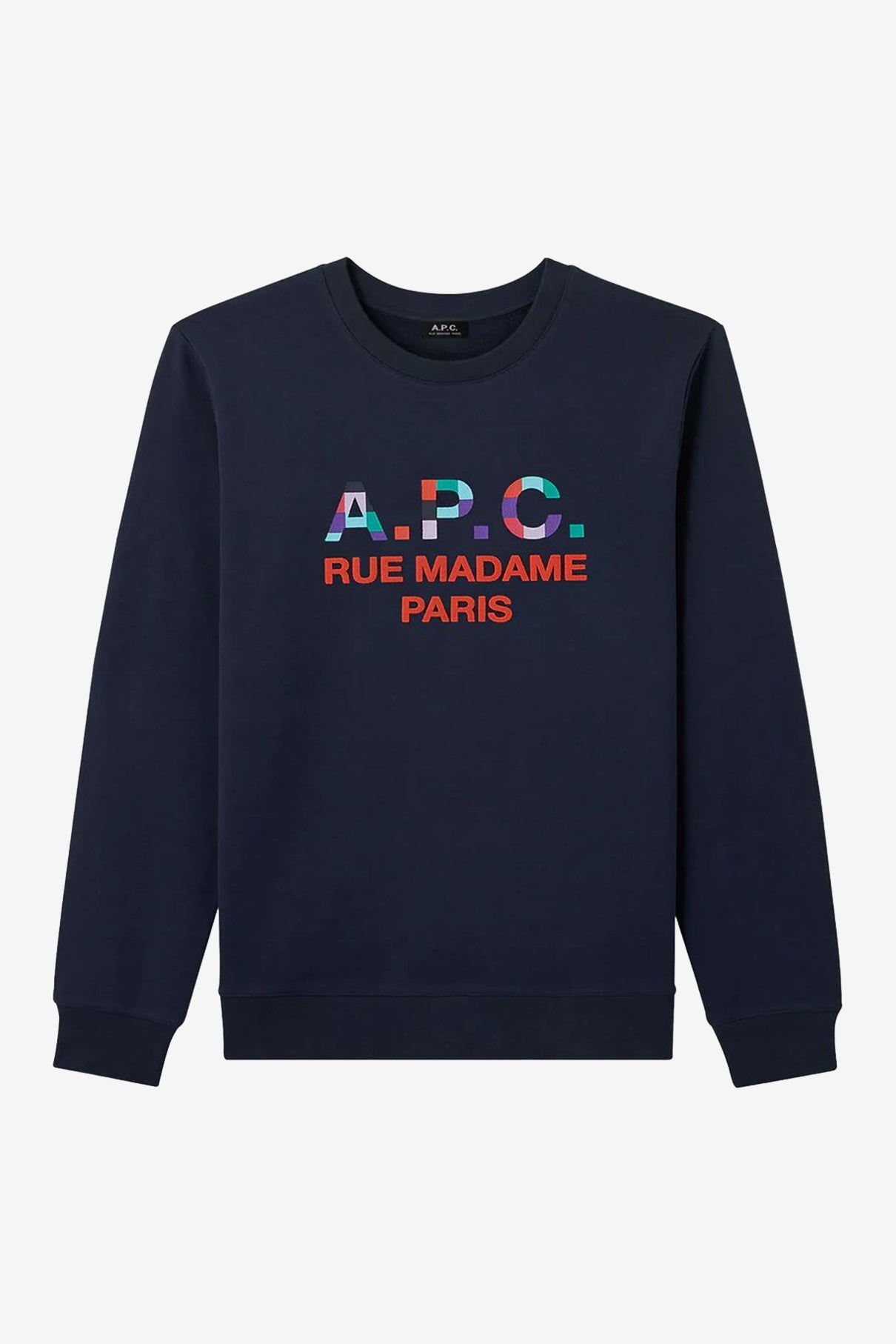 A.P.C. 以高質感的日常必備單品在時尚界成為低調而搶手的品牌。這件為經典款衛衣,正面的多彩色塊組成了A.P.C.標誌,再以深藍搭配醒目的’Rue Madame Paris’紅字,簡約版型不失個性此款亦有白色短袖款