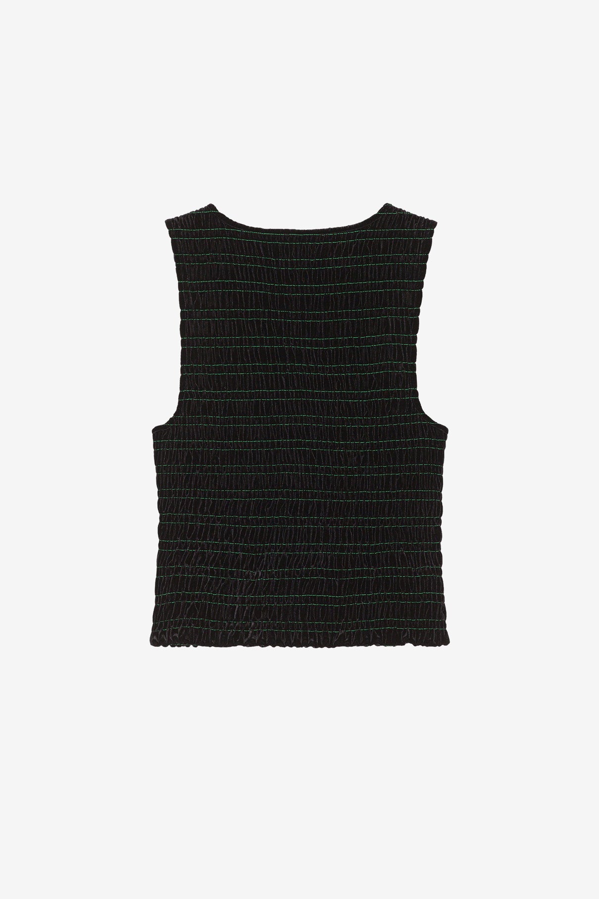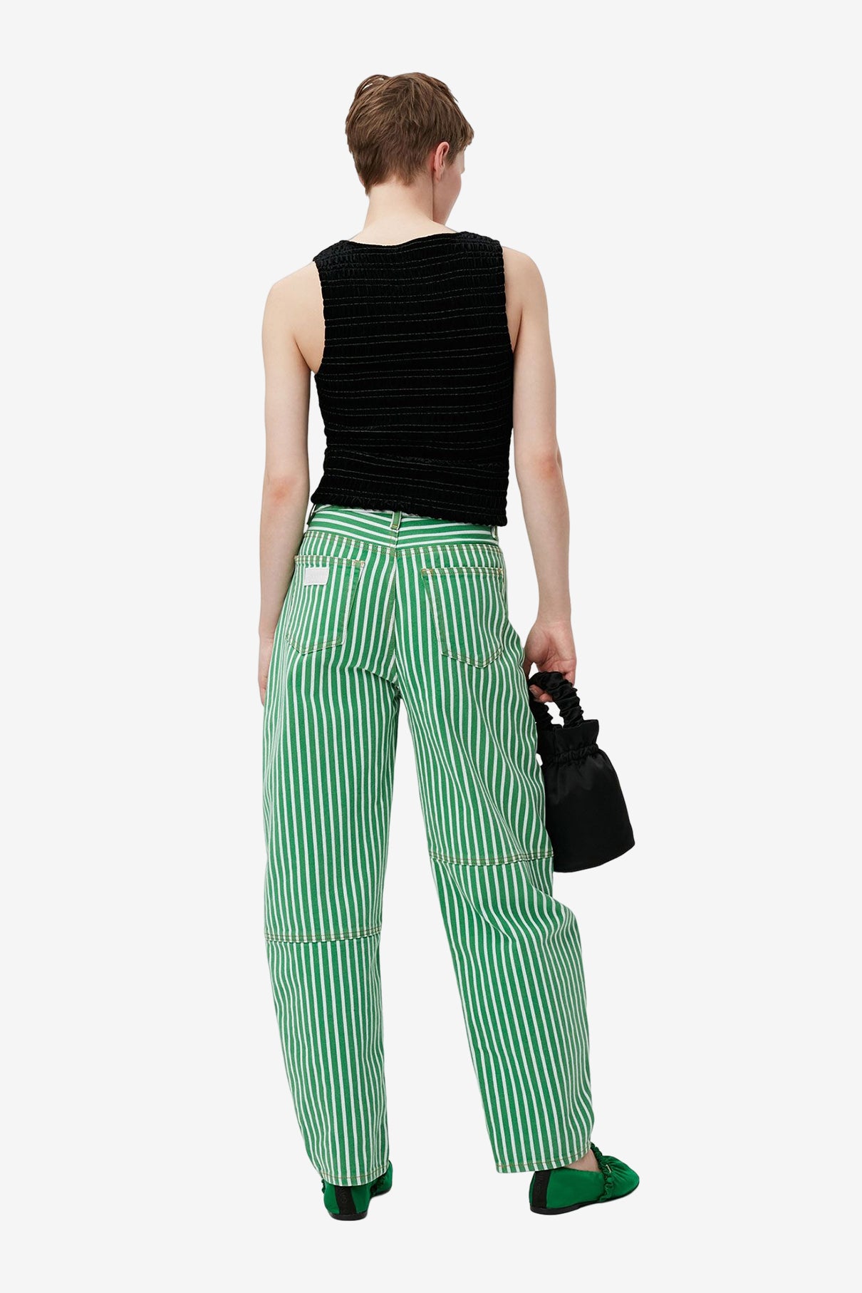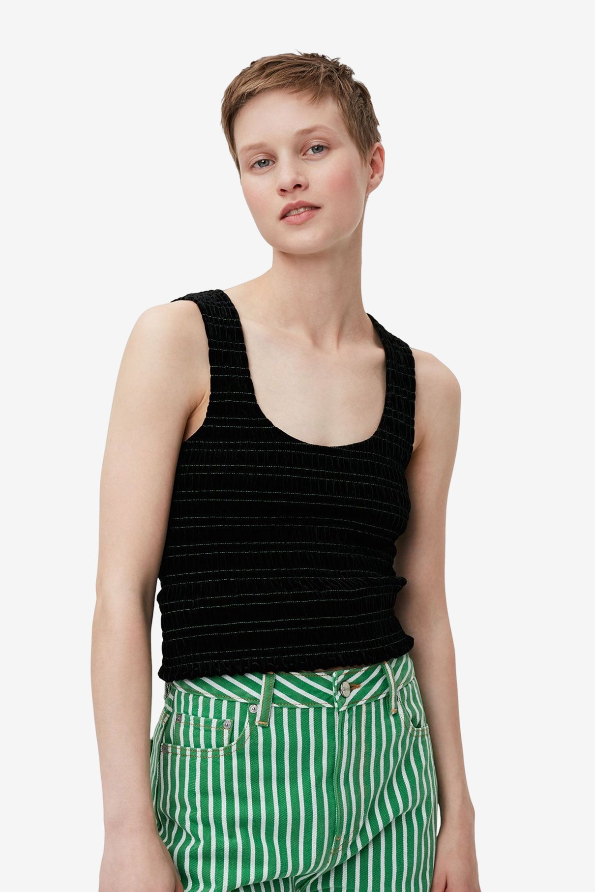 來自丹麥的 GANNI 以活潑趣味的服裝出名。此款 Velvet Smock Top 選用細膩的天鵝絨,除了柔軟觸感外,隱約散發的光澤展現低調質感,黑底與鮮綠色車縫線相間,採用合身及略為短版的剪裁,無論是牛仔褲或裙裝皆可任意搭配。模特兒下著為 Stripe Denim Stary - Kelly Green。